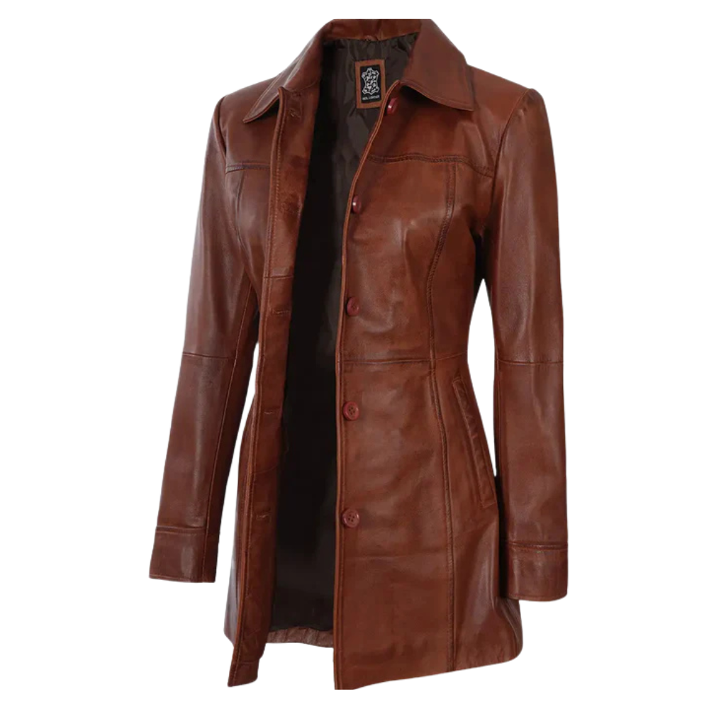 Womens Petite Cognac Brown Leather 3/4 Length Coat