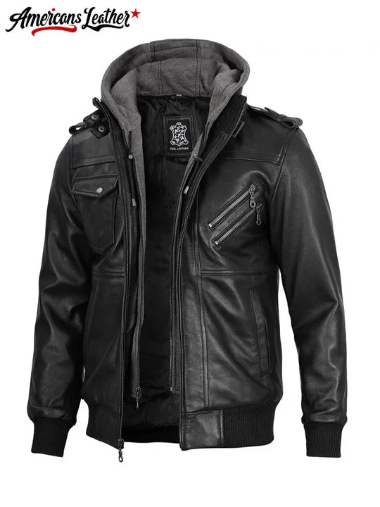 Women's Black Leather Jacket With Removable Hood