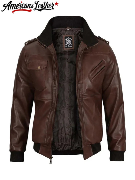 Tall Mens Bomber Dark Brown Removable Hooded Leather Jacket