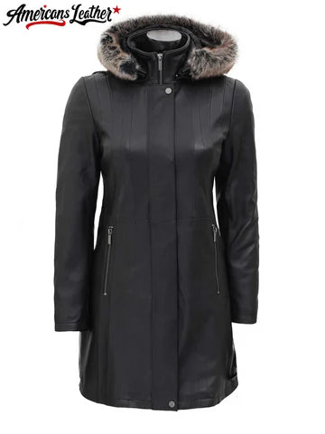 Women’s Black 3/4 Length Leather Coat With Hood