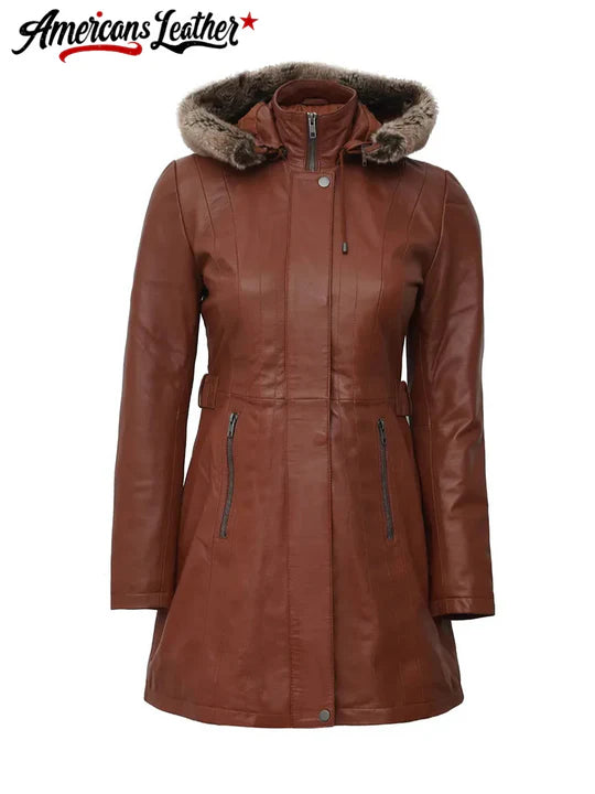 Womens Petite Cognac Brown Leather 3/4 Length Coat