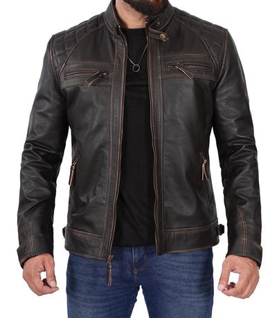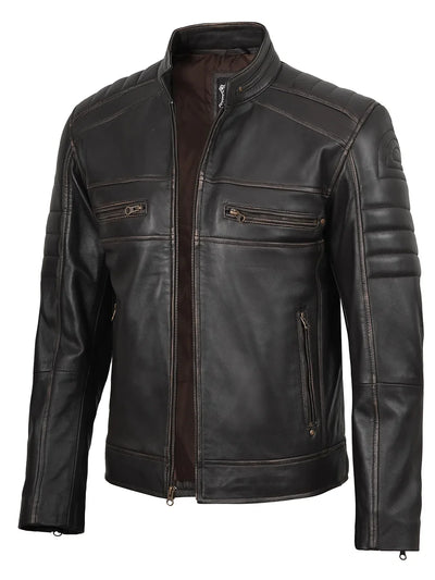 Men's Rub Off Dark Brown Cafe Racer Leather Jacket