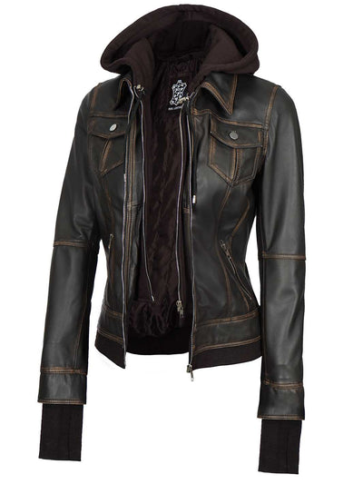 Tralee Women Dark Brown Bomber Leather Jacket With Removable Hood