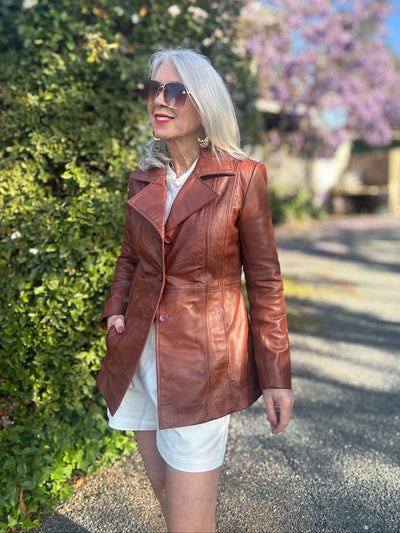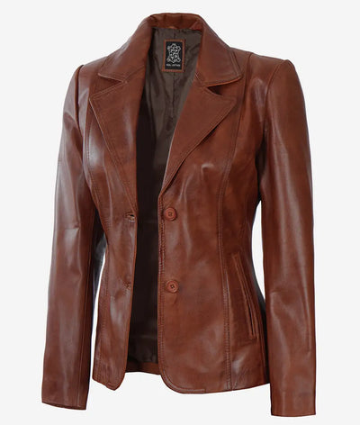 Women's Two Button Tan Brown Leather Blazer Jacket