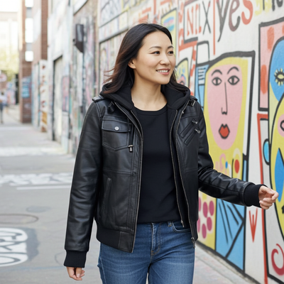 Edinburgh Women's Bomber Black Leather Jacket with Removable Hood