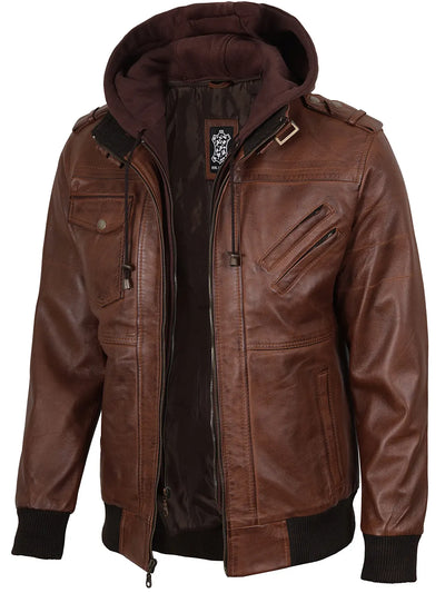 Edinburgh Mens Brown Bomber Leather Jacket With Removable Hood