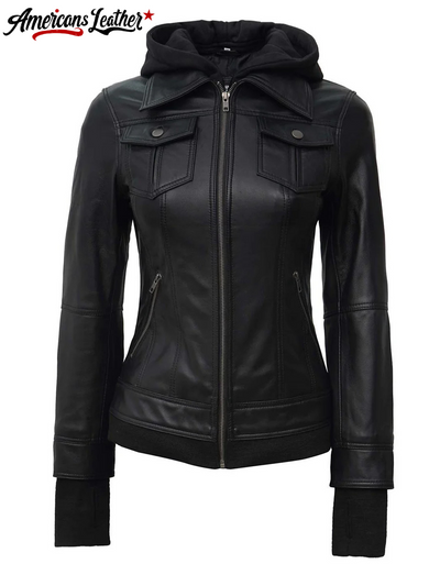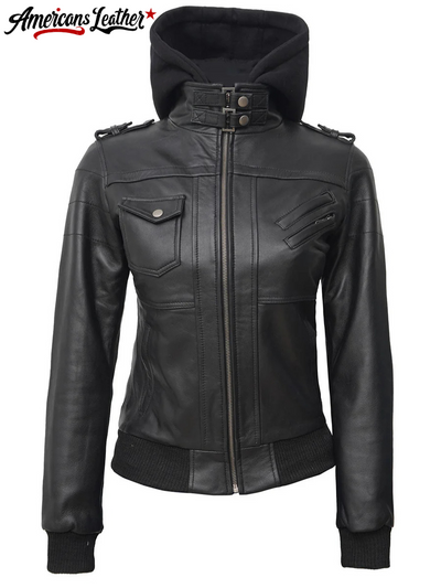 Tralee Petite Women’s Black Motorcycle Leather Jacket with Hood