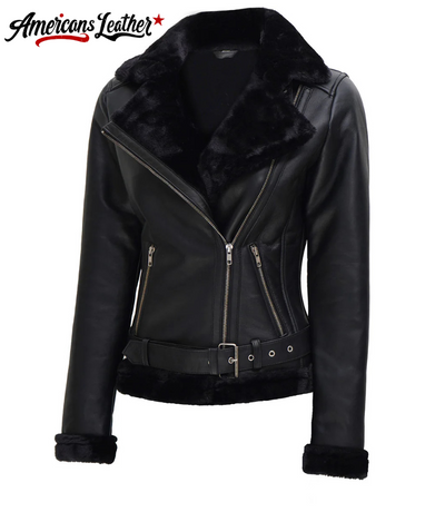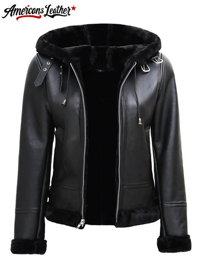 Grace Black Real Leather Hooded Shearling Jacket Women