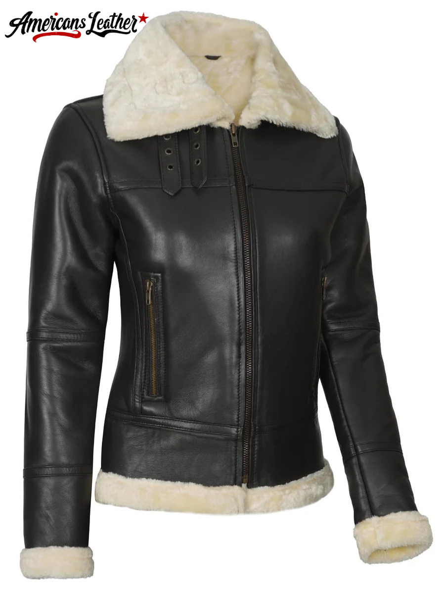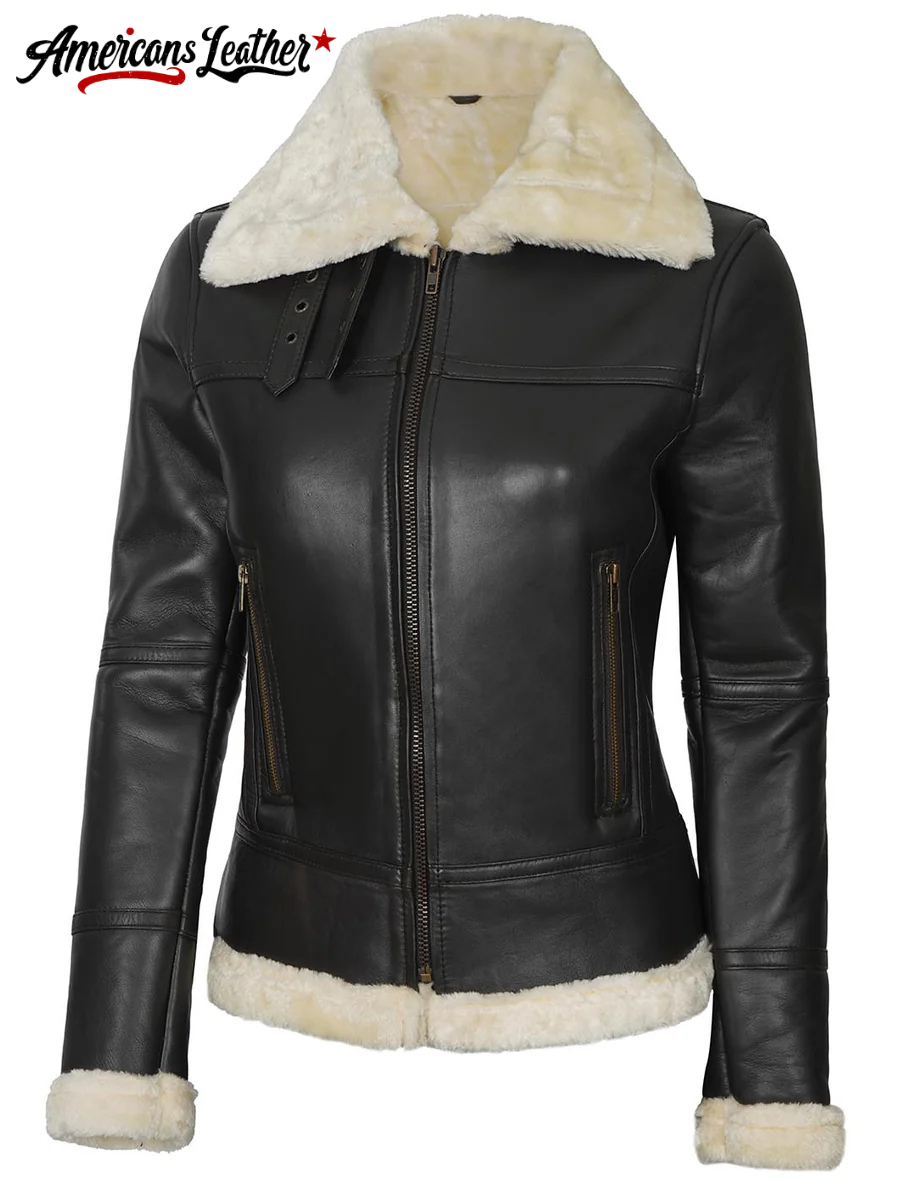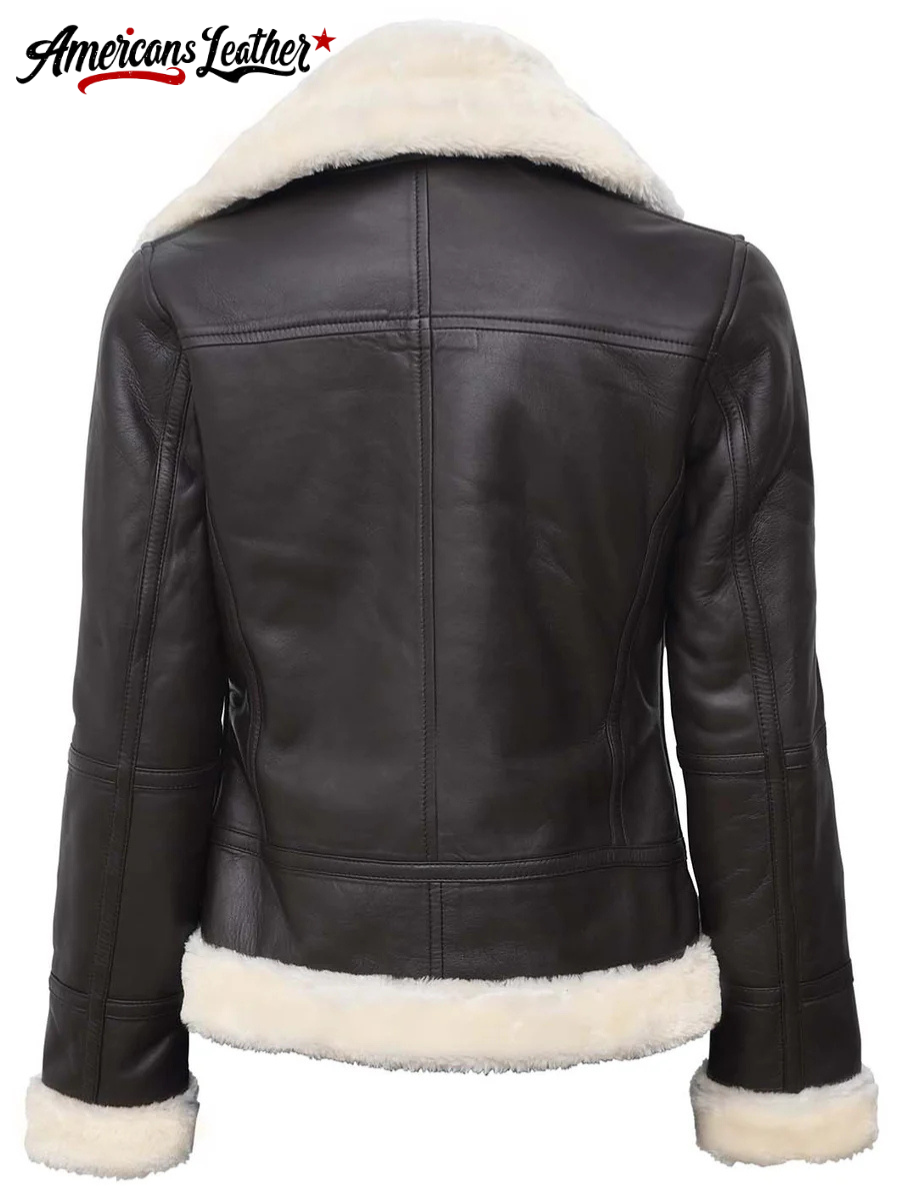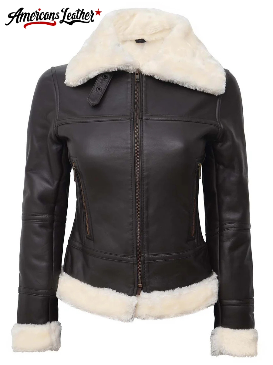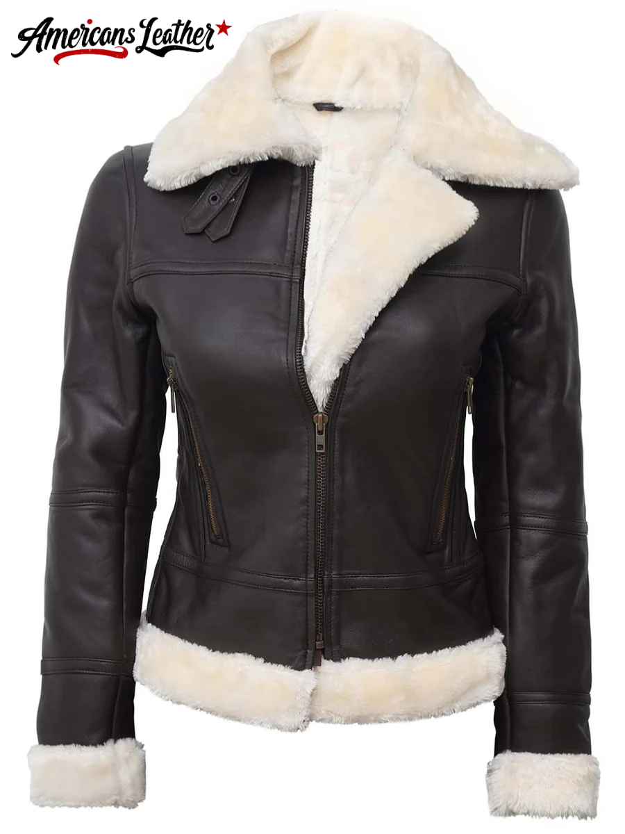 The design of the Women’s Dark Brown Leather Shearling Jacket effortlessly blends classic charm with modern appeal. Its fitted silhouette flatters your figure while offering comfortable mobility. Featuring a front zipper closure, this piece adds a contemporary edge and ensures convenient wear.