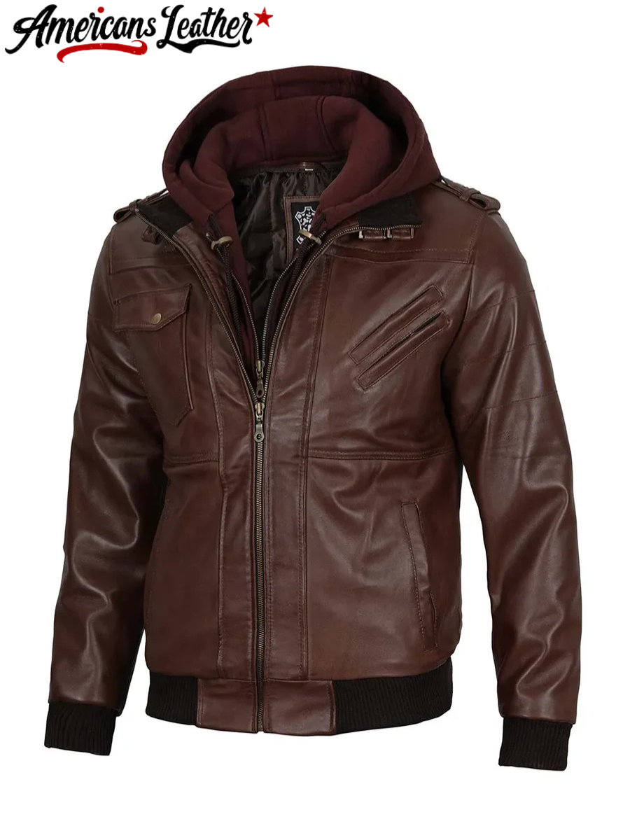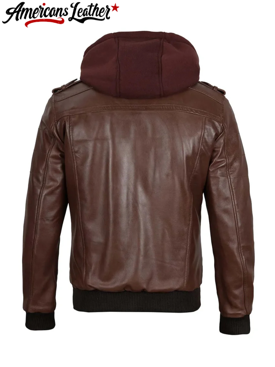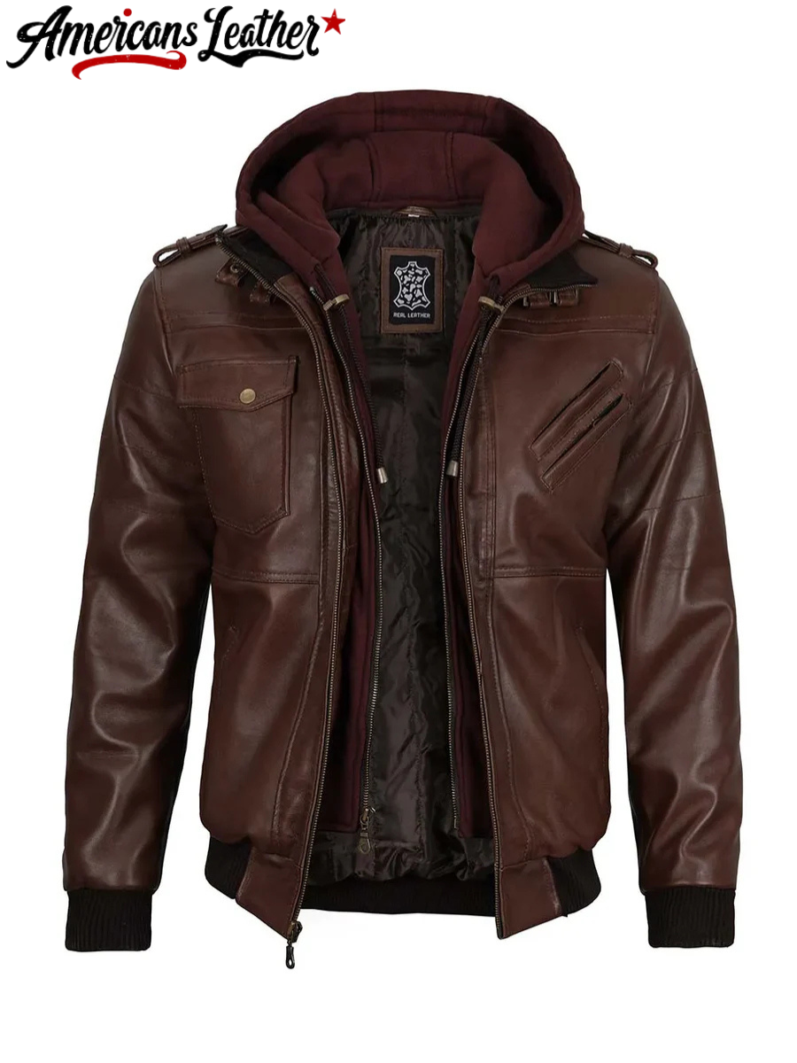 The Edinburgh Men’s Bomber Dark Brown Leather Jacket with Removable Hood – a fusion of modern style and versatile functionality. Crafted to meet the needs of the contemporary man, this jacket offers the perfect balance of urban fashion and rugged practicality.