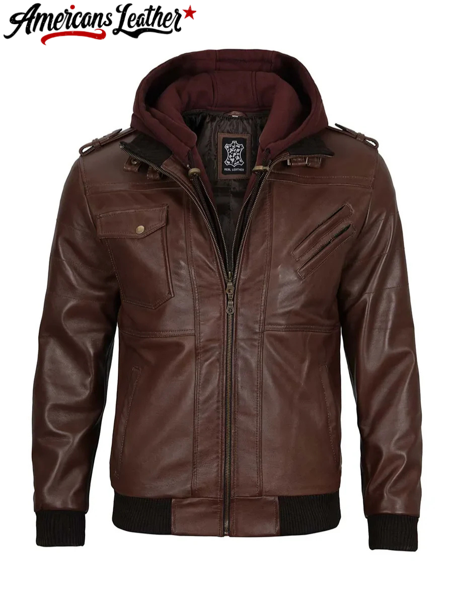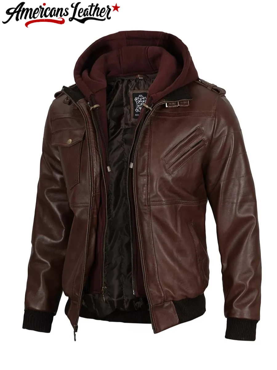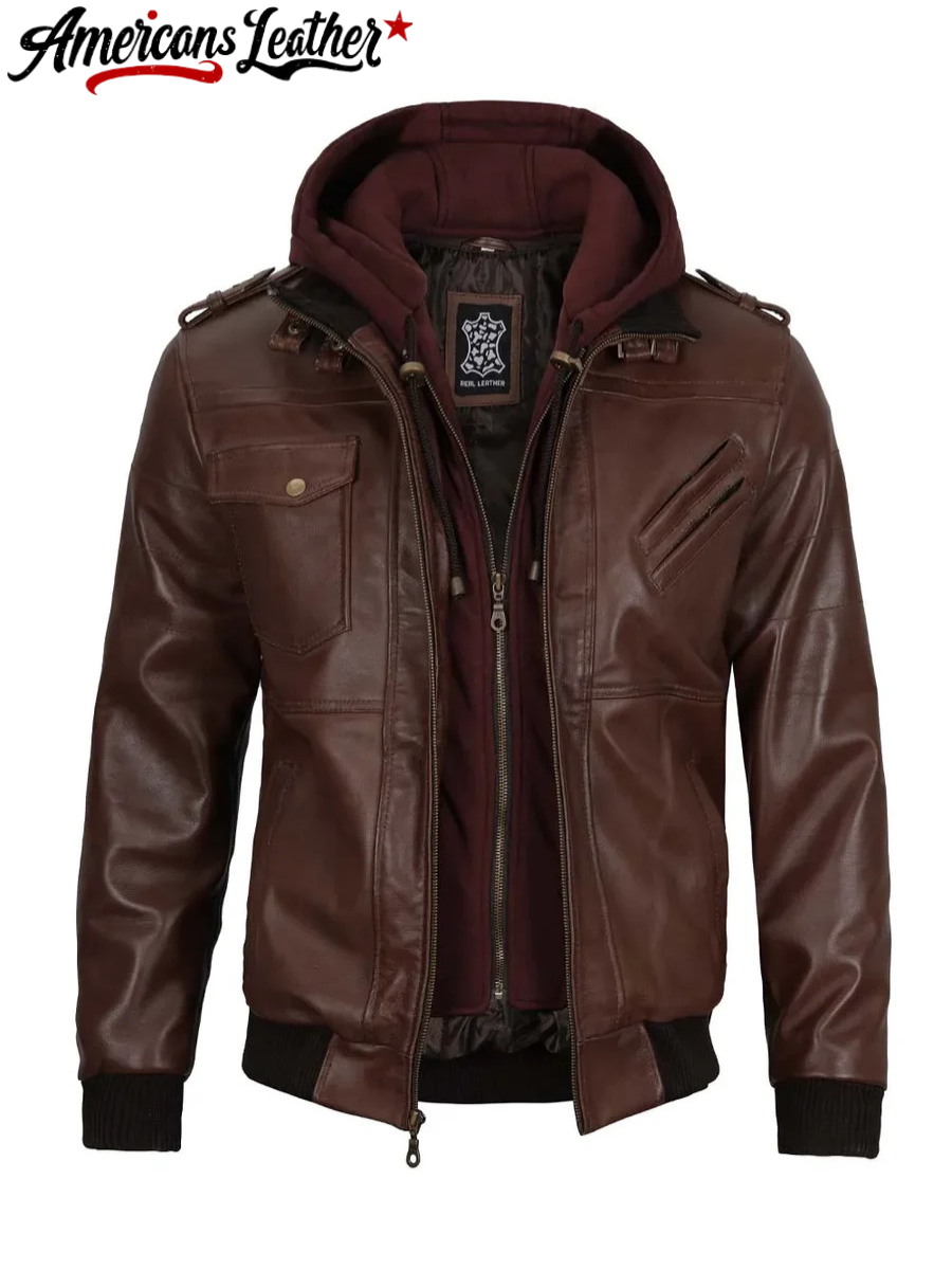 The Edinburgh Men’s Bomber Dark Brown Leather Jacket with Removable Hood – a fusion of modern style and versatile functionality. Crafted to meet the needs of the contemporary man, this jacket offers the perfect balance of urban fashion and rugged practicality.