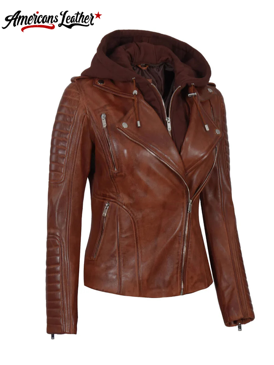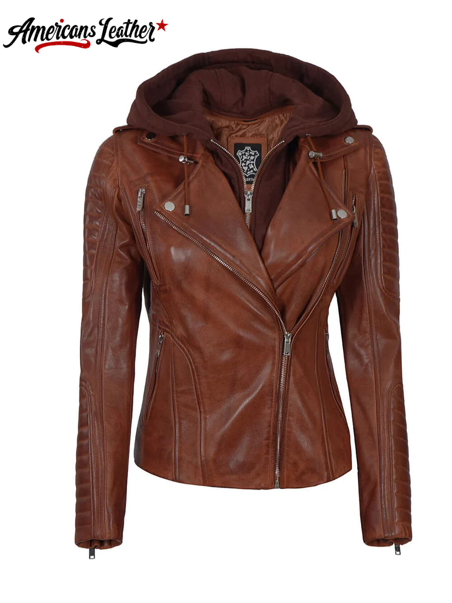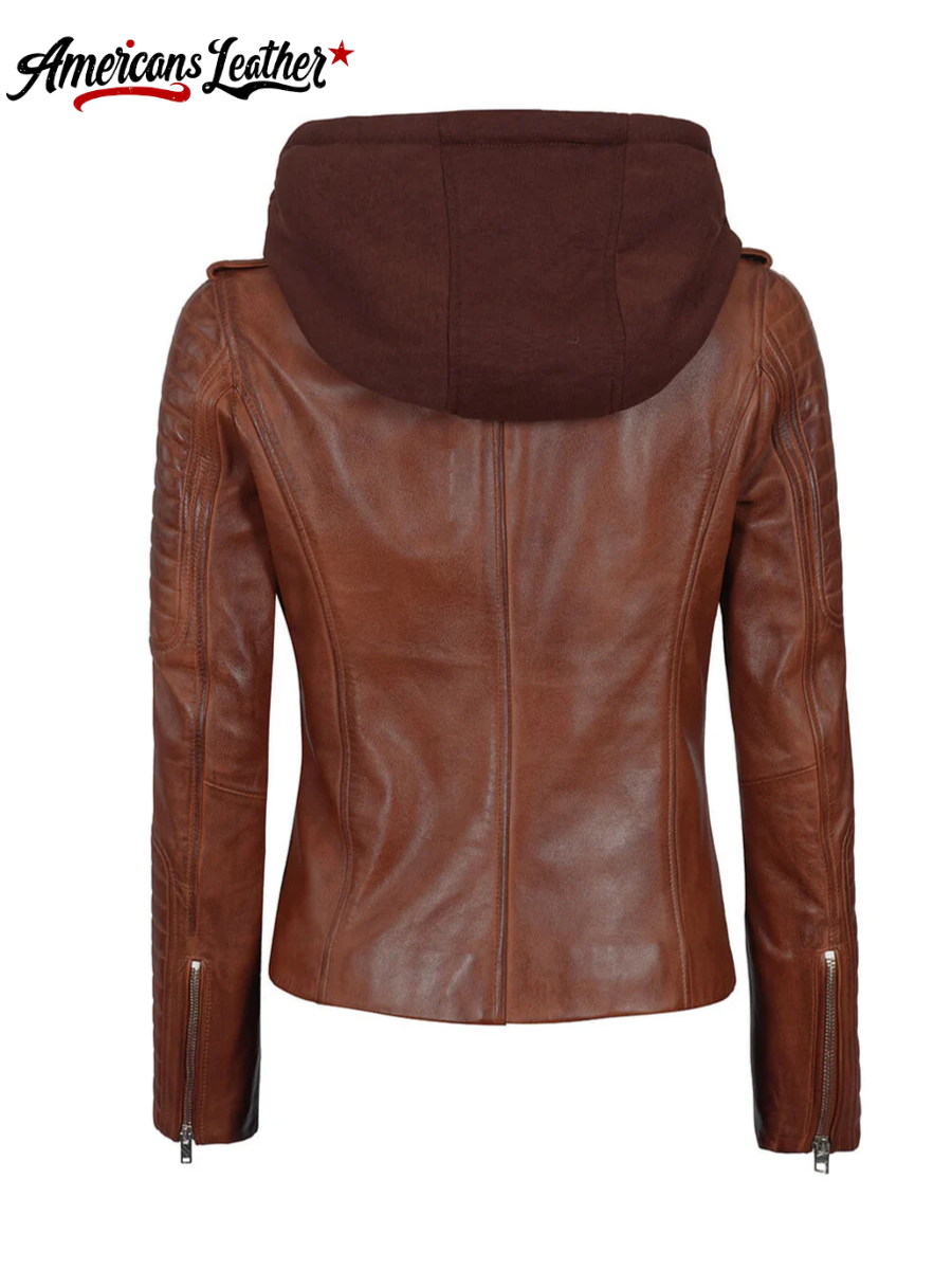 Bagheria Women Cognac Biker Leather Jacket With Removable Hood