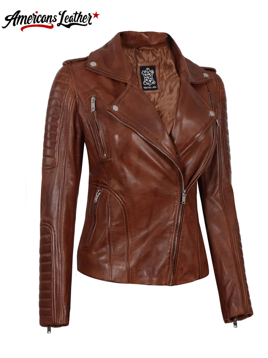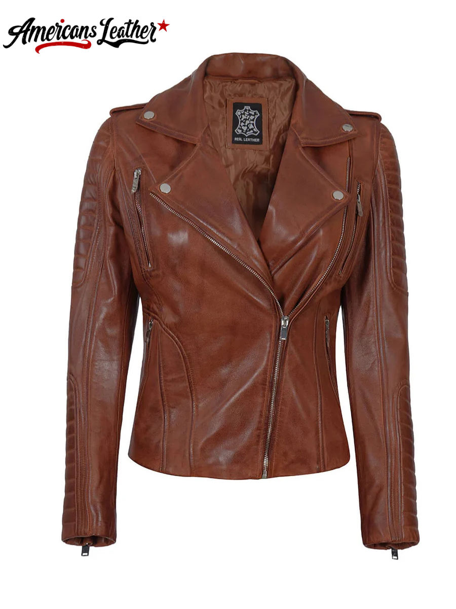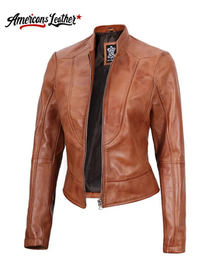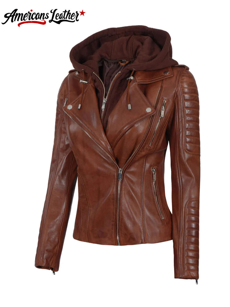 Bagheria Women Cognac Biker Leather Jacket With Removable Hood