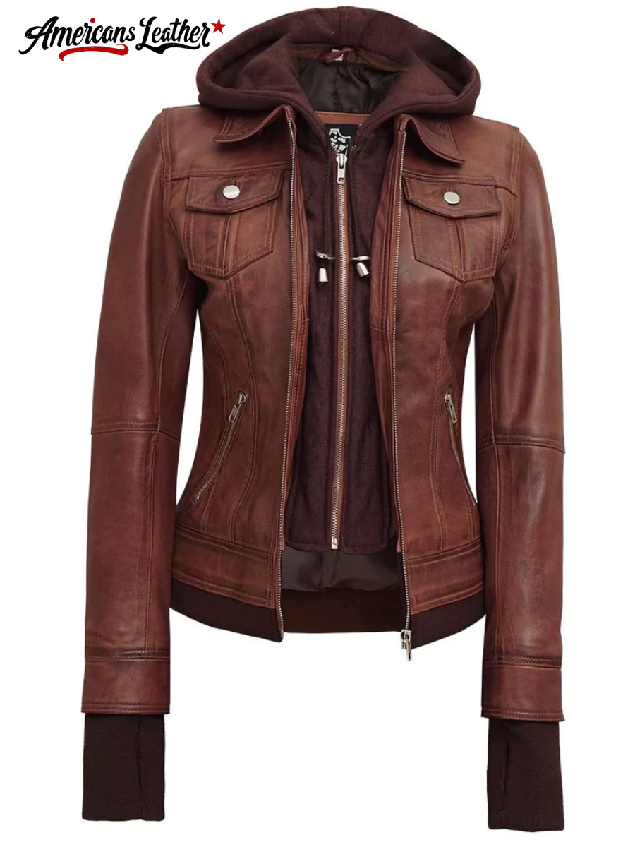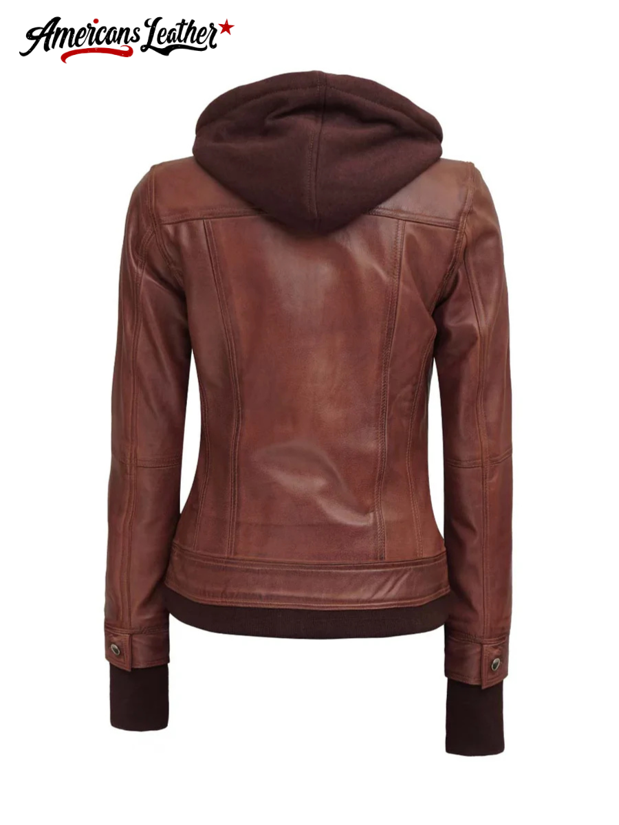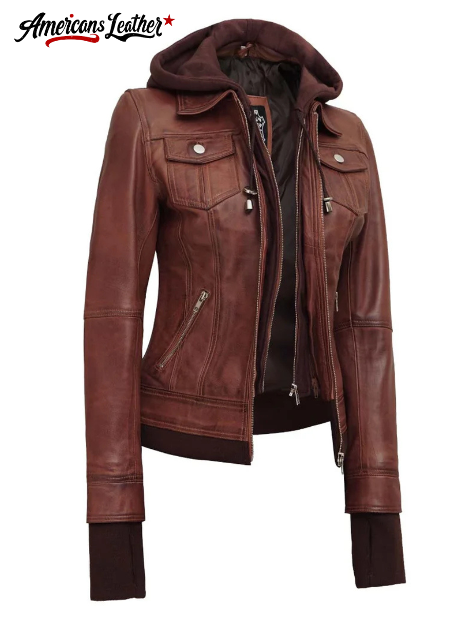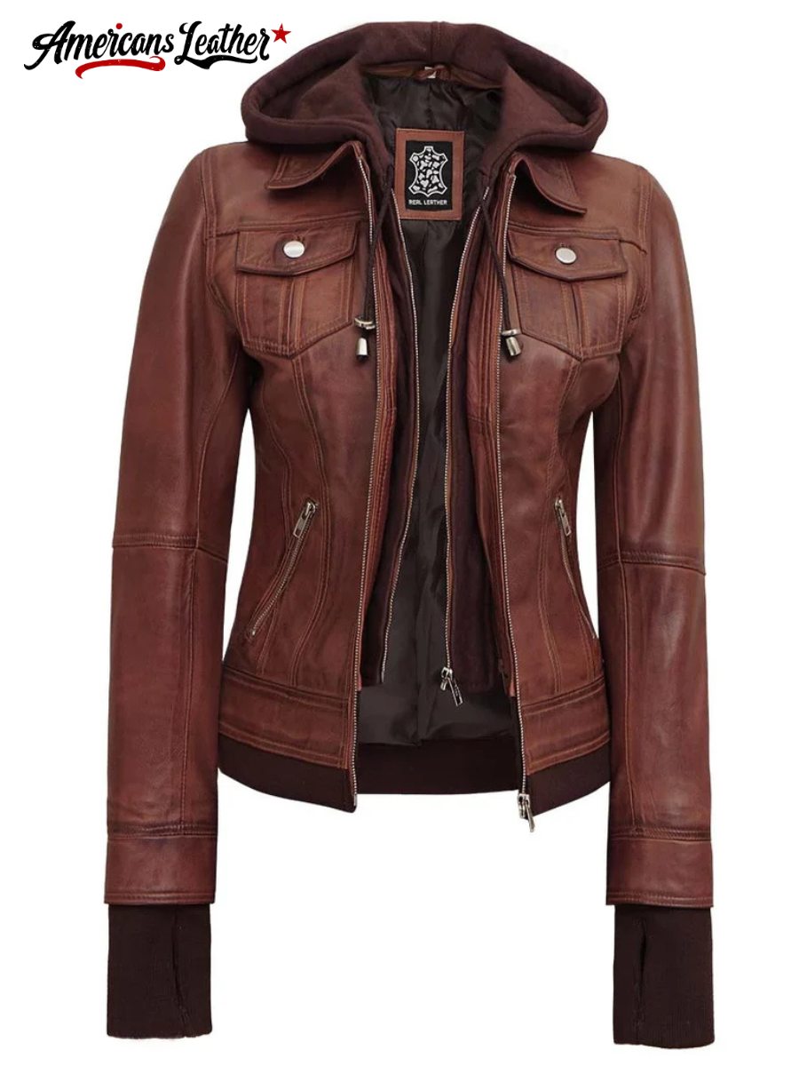 Dark Brown Women’s Bomber Leather Jacket with Removable Hood