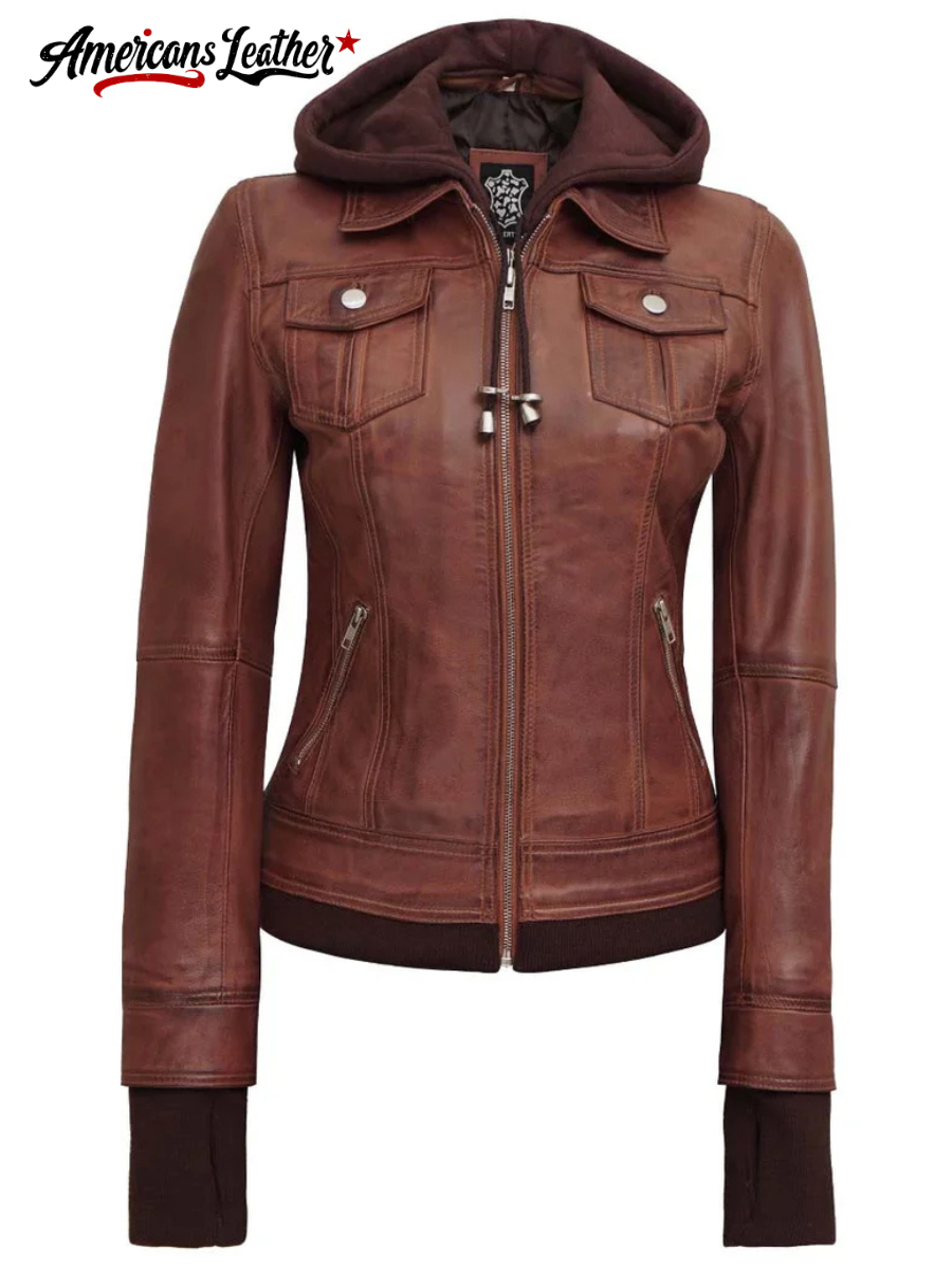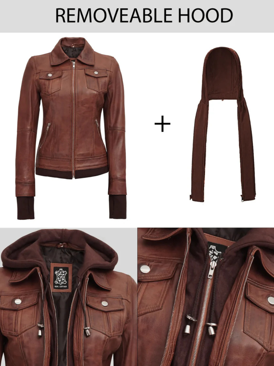 Effortlessly stylish and functional, our Dark Brown Women’s Bomber Leather Jacket with Removable Hood is perfect for any season. Crafted from genuine lambskin, it features a detachable hood for versatile wear, four exterior pockets for convenient storage, and thumbholes for an ideal fit and added warmth.