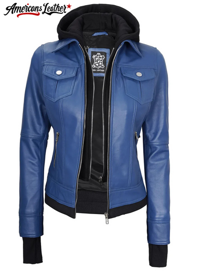 Betty Blue Leather Bomber Jacket With Removable Hood