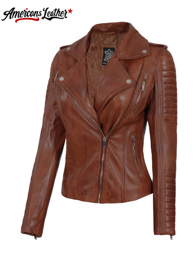 Bagheria Women Cognac Biker Leather Jacket With Removable Hood