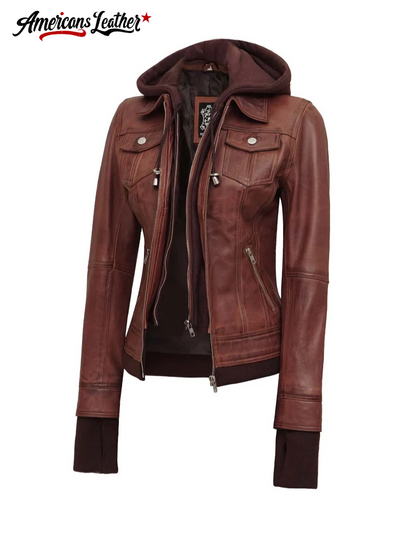 Dark Brown Women’s Bomber Leather Jacket with Removable Hood
