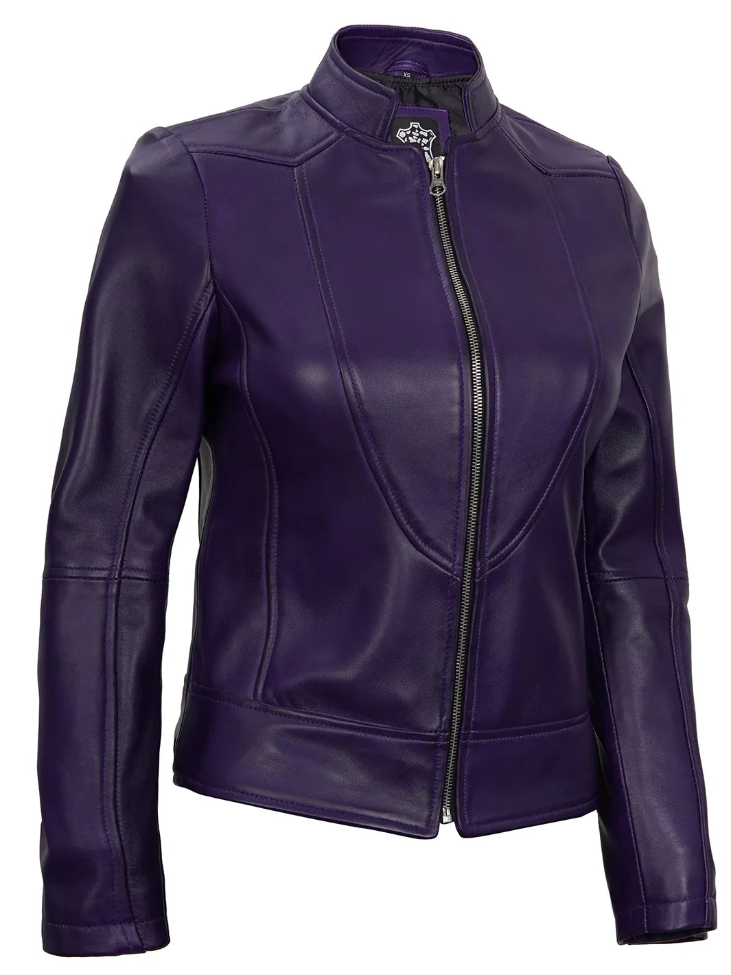 Style up your biker fashion with this stylish and functional Women's Cafe Racer Style Purple Leather Jacket. Perfect for hitting the open road or exploring the city streets, its meticulously crafted lambskin leather exterior adds sophistication and a moto-inspired attitude to your wardrobe.
