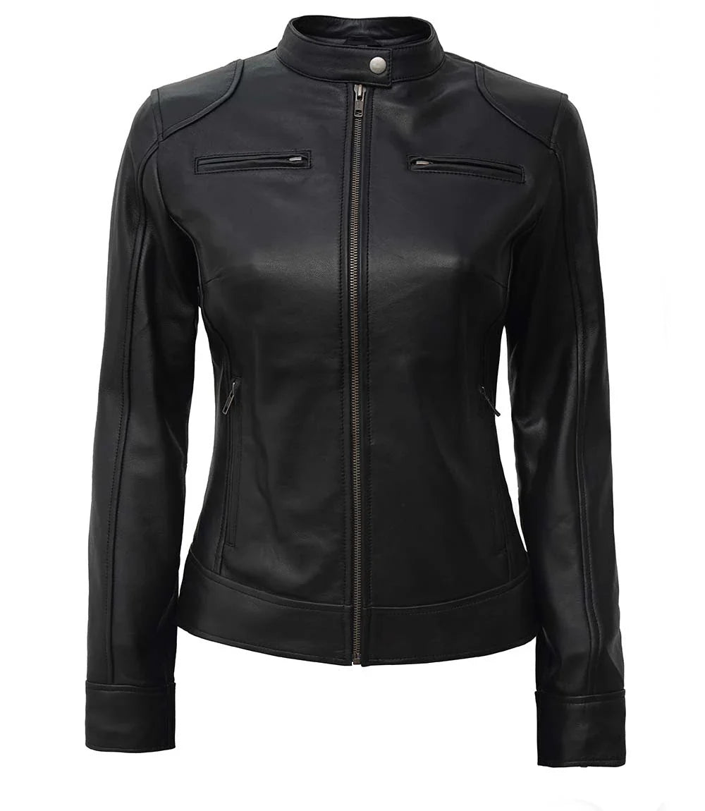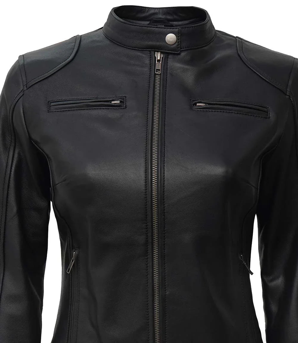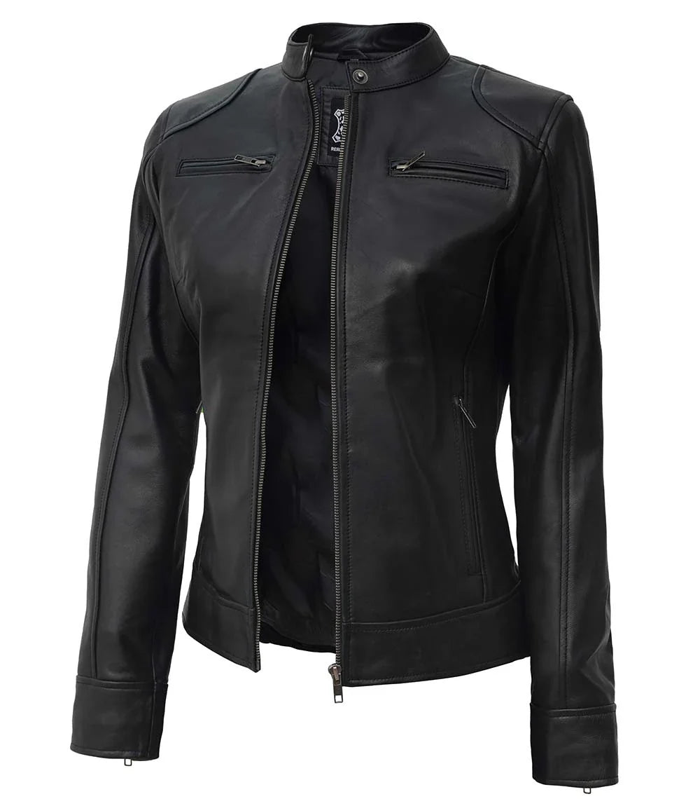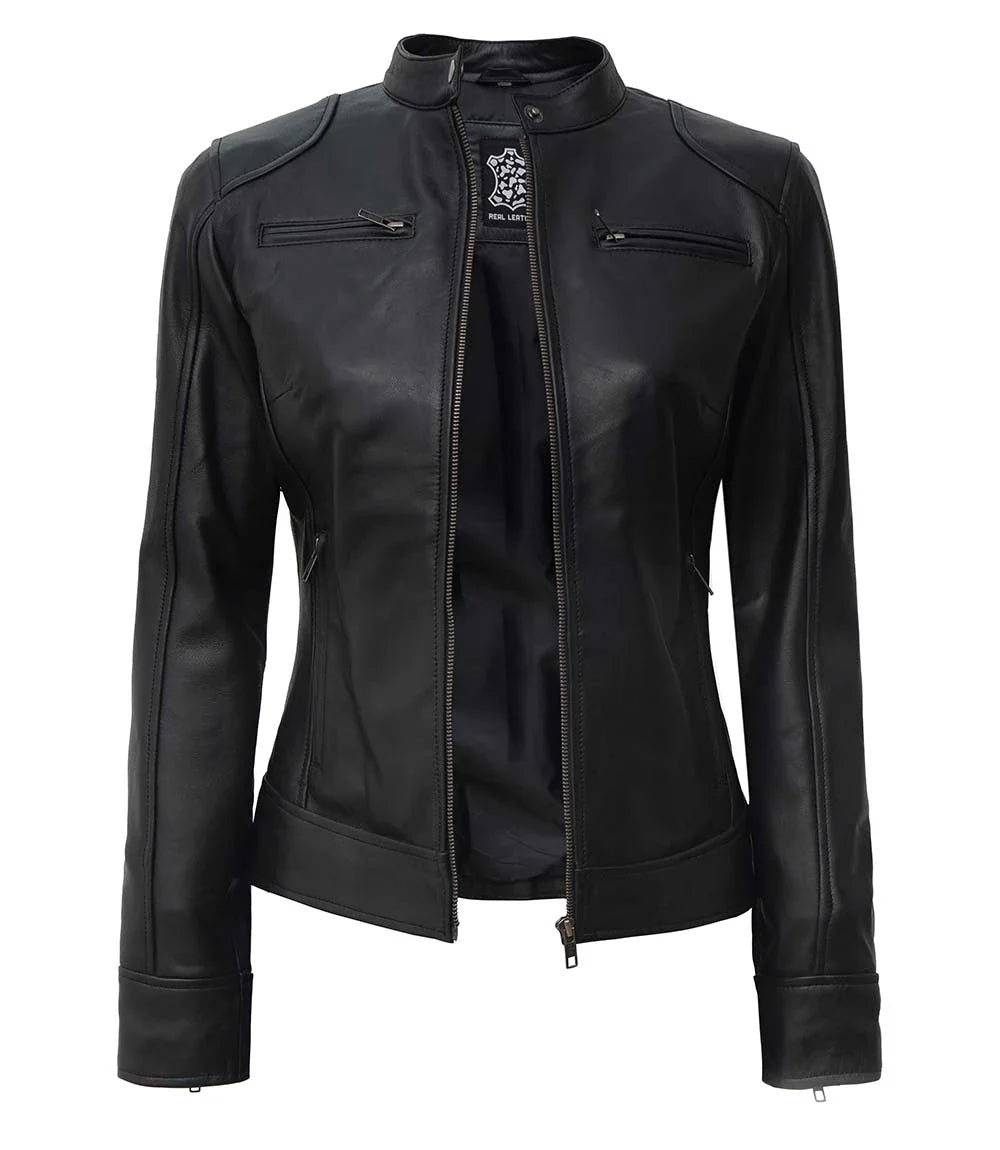 Tailored for heights 5'9" to 6'0", this Dodge women's rugged yet refined jacket is crafted from 100% real lambskin leather with natural grain texture. Fully lined with polyester for comfort, it delivers bold, biker-inspired style with practical functionality.