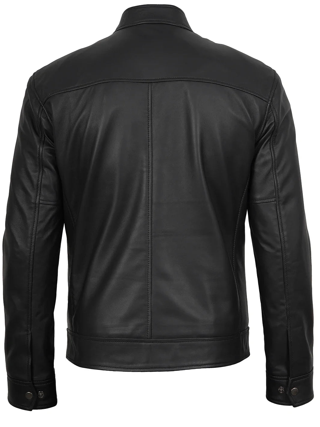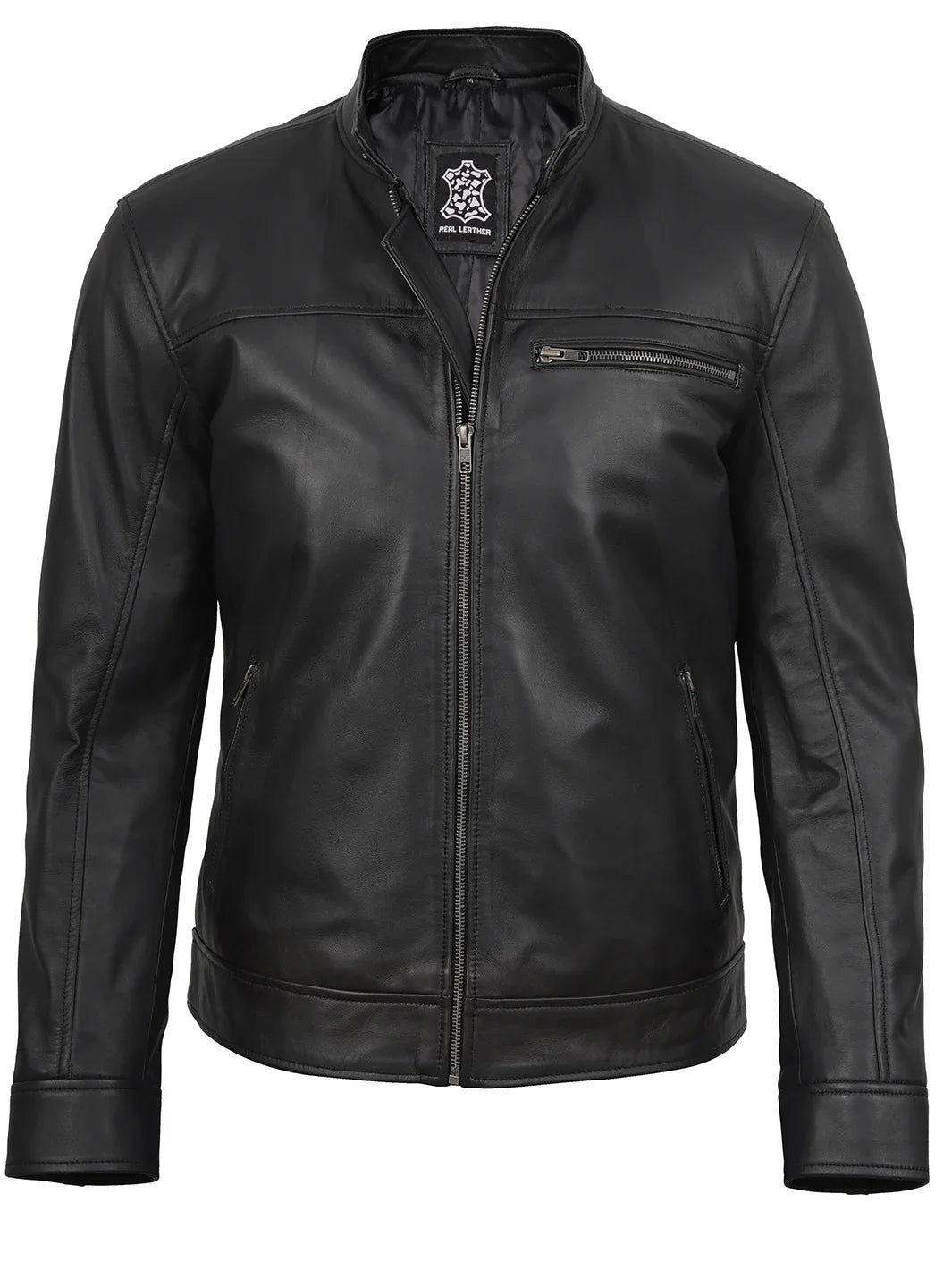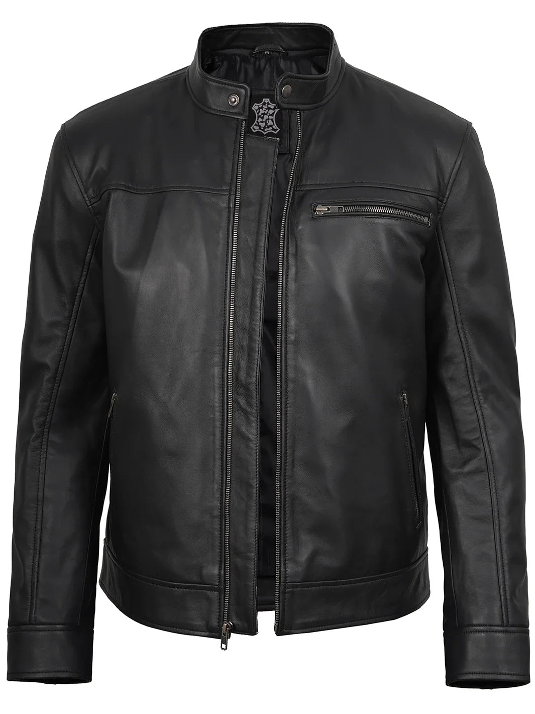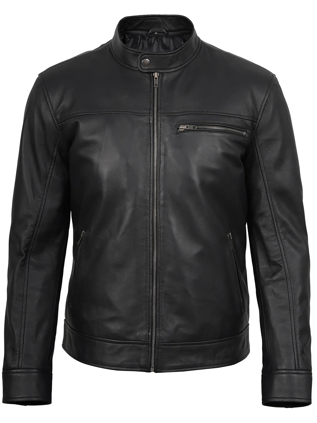 Channel your inner rebel with this men's black cafe racer style jacket crafted from hand-picked lambskin leather. Features a snap-tab collar, zipped closure, and a minimalist design with a single chest zip pocket. Perfect for urban rides or casual outings.