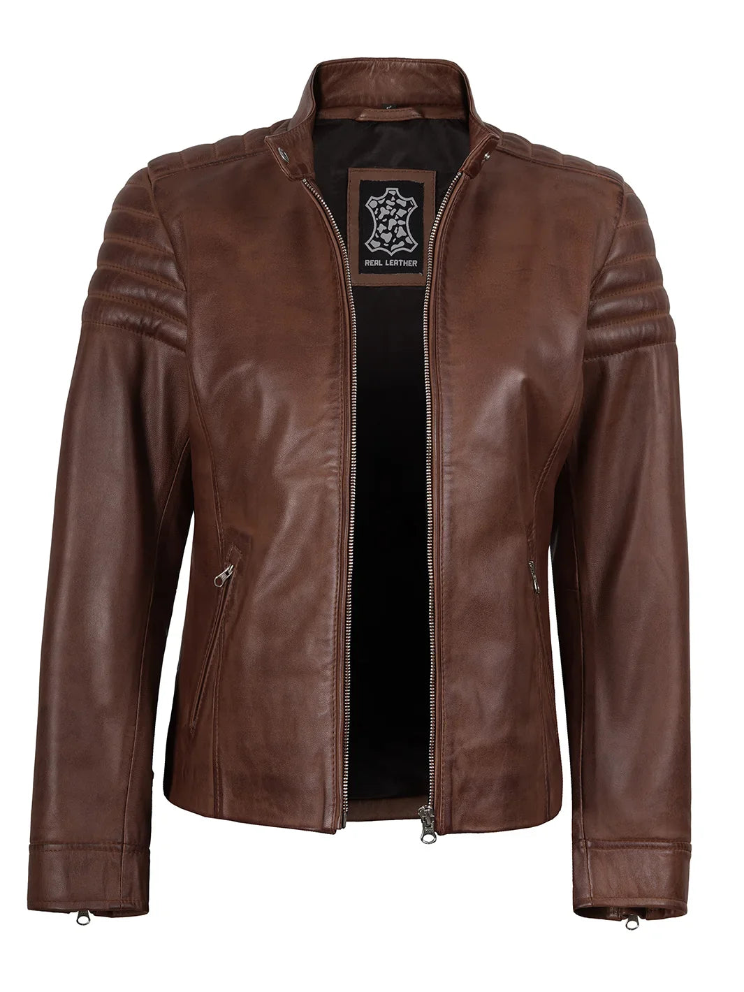 The Carrie Cognac Padded Cafe Racer Style Leather Jacket for Women offers effortless style. Its classic leather aesthetic showcases exclusive lambskin leather and broad lapels.