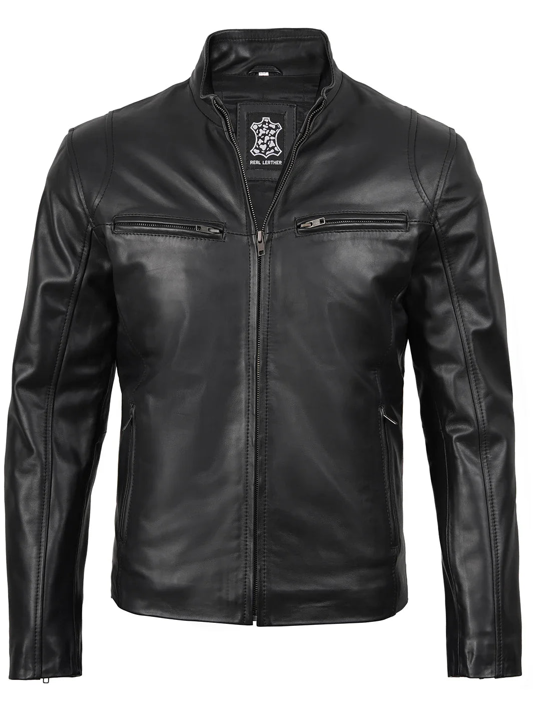 Designed for daily wear with an edge, this black cafe racer leather jacket offers a sleek look and minimalist design. Made from real lambskin leather, it features a stand-up collar, smooth zipper closure, and ample zippered pockets. Whether you're riding or relaxing, it brings modern attitude to any outfit.