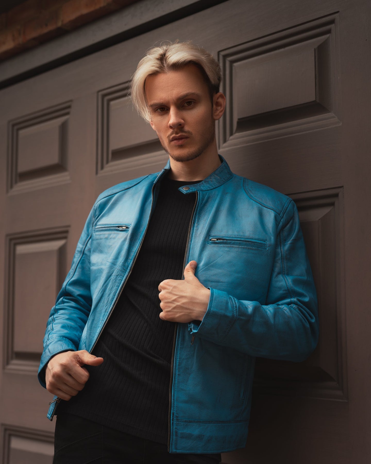 The Dodge Men's Cafe Racer Style Blue Leather Jacket is a bold and distinctive piece of outerwear that encapsulates the spirit of adventure and style. Crafted to stand out from the crowd, this jacket combines classic design elements with a contemporary twist, making it a true fashion statement.