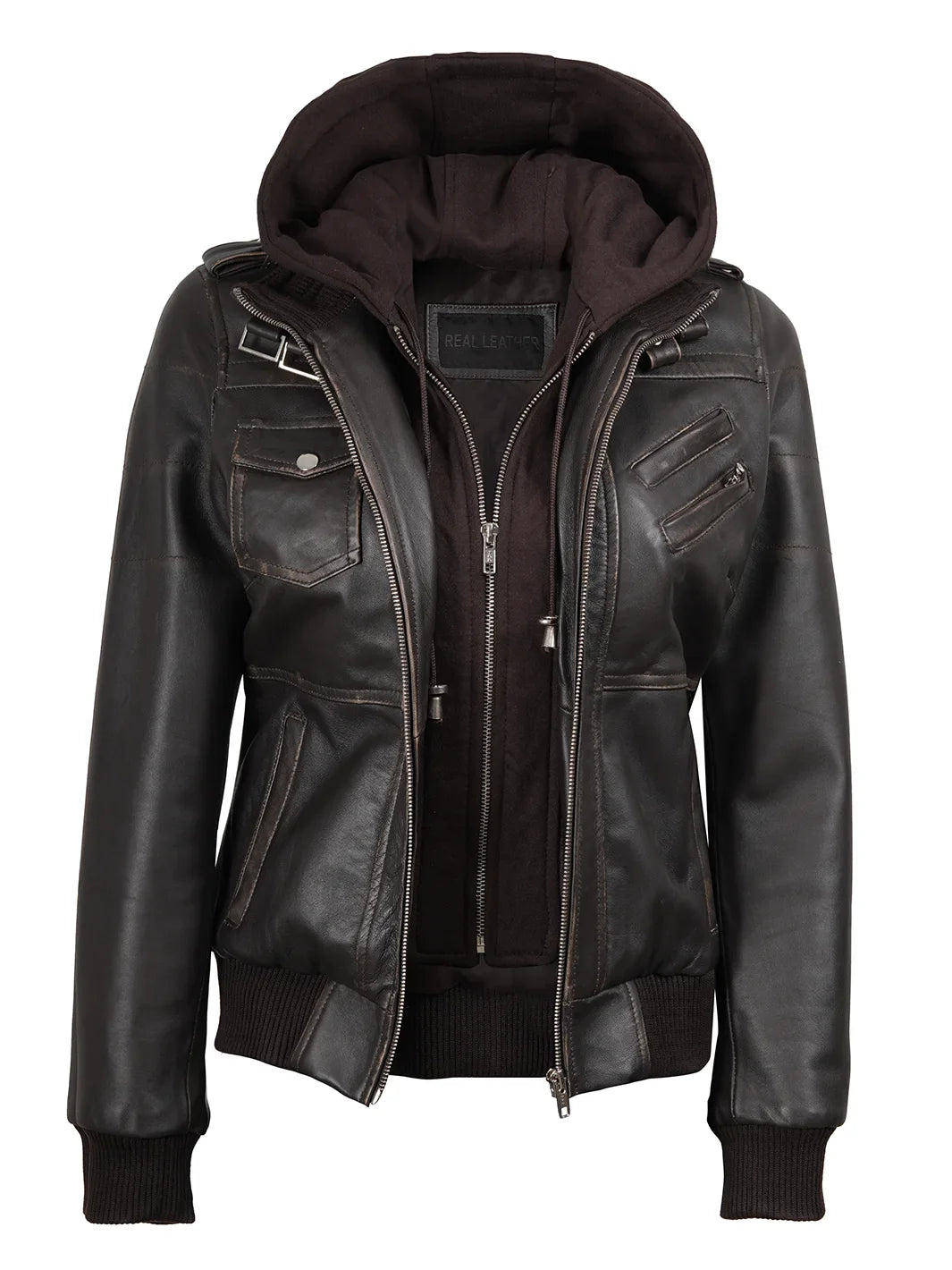 Edgy, elegant, and effortlessly cool. Made from 100% real lambskin leather with a striking rub-off finish, it features a detachable hood, zip closure with drawstrings, and rib-knit cuffs for comfort. Includes a belted buckle collar and three exterior plus one interior pocket. Dark brown hue adds bold style to any look—professional leather cleaning recommended.