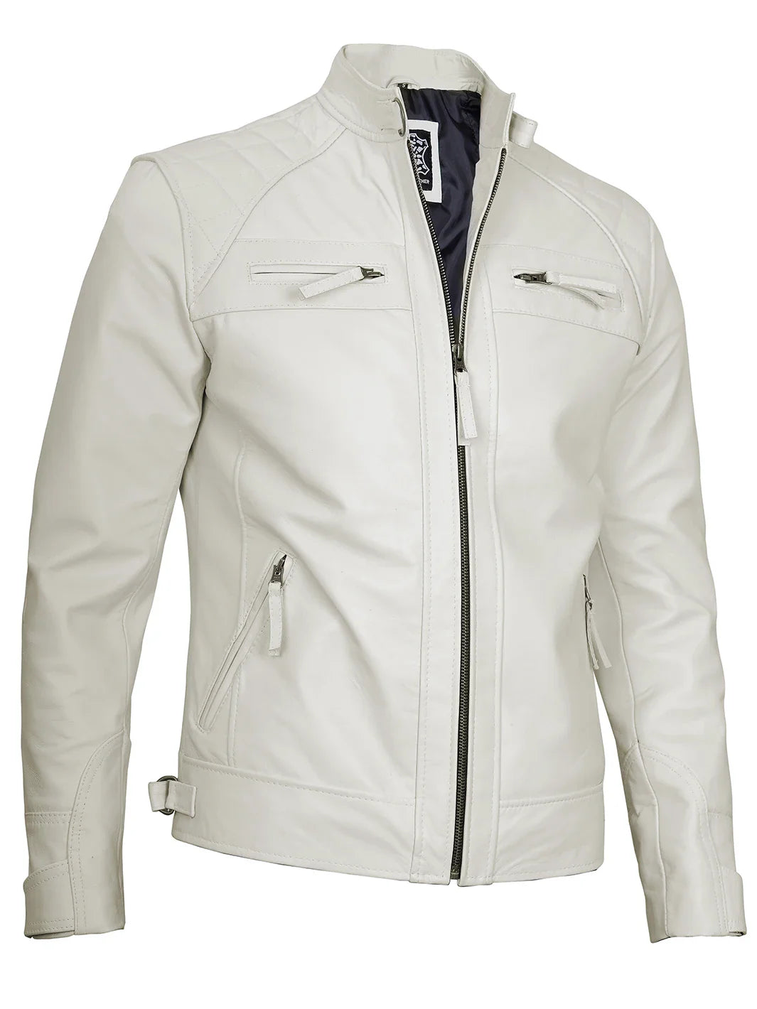 Ride into style with the Johnson off-white cafe racer jacket, crafted from real lambskin for a sleek finish. Featuring quilted shoulder details, a snap-tab collar, and belted waist adjustments, it offers both edge and comfort. With multiple secure pockets, it’s built for everyday wear with standout appeal.