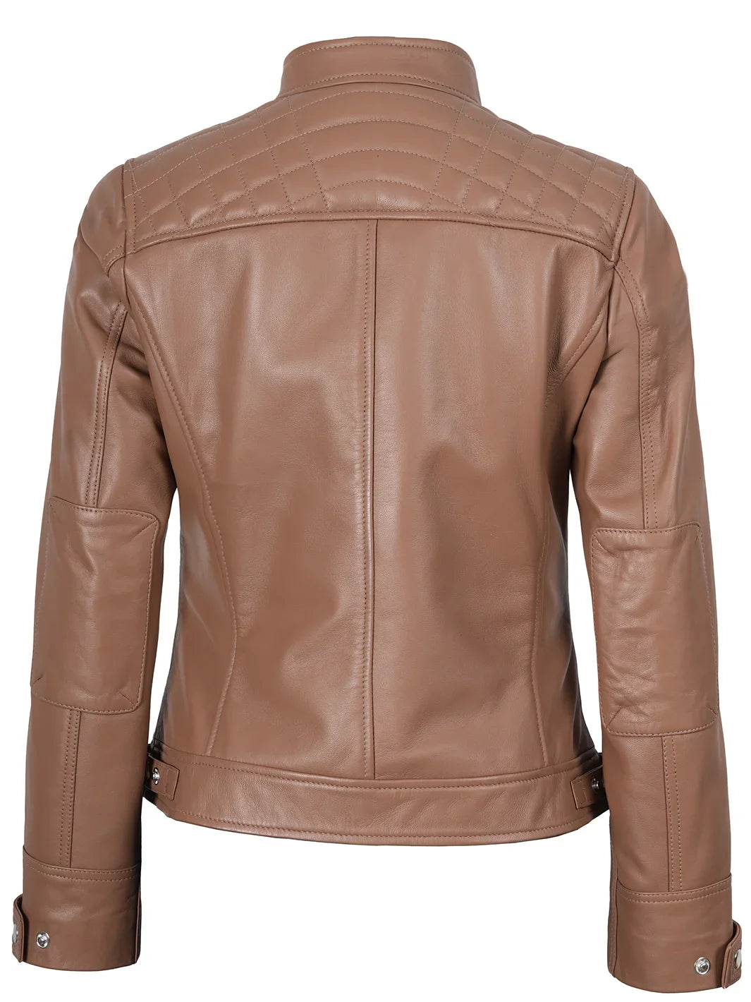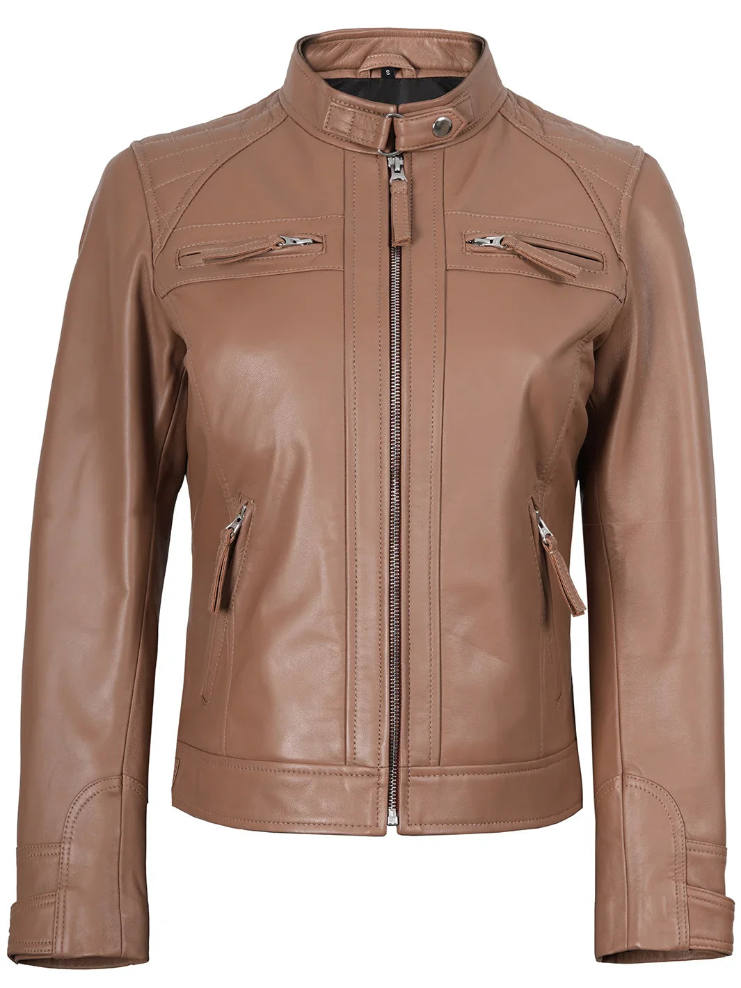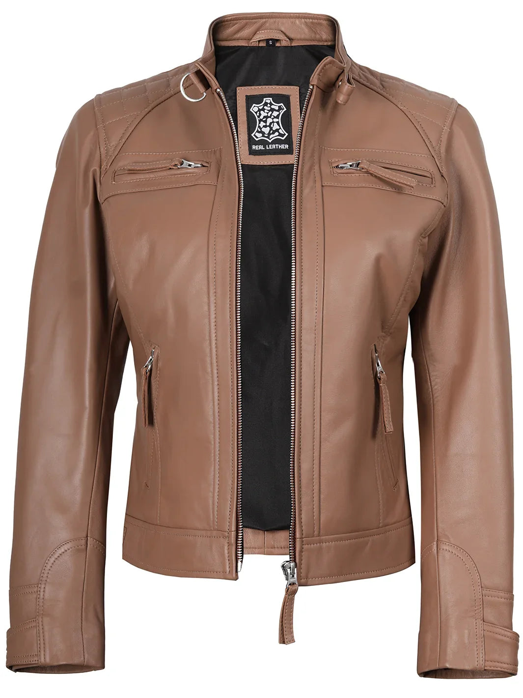 This mocha cafe racer jacket, constructed from real leather, presents a refined and feminine silhouette. Quilted shoulder panels offer added warmth while giving a stylish twist to the classic biker style. It features a full-length zipper, four exterior zip pockets, and an inner pocket to securely hold your belongings. The snap-fastening stand collar and adjustable side tabs ensure a tailored fit with a modern edge.