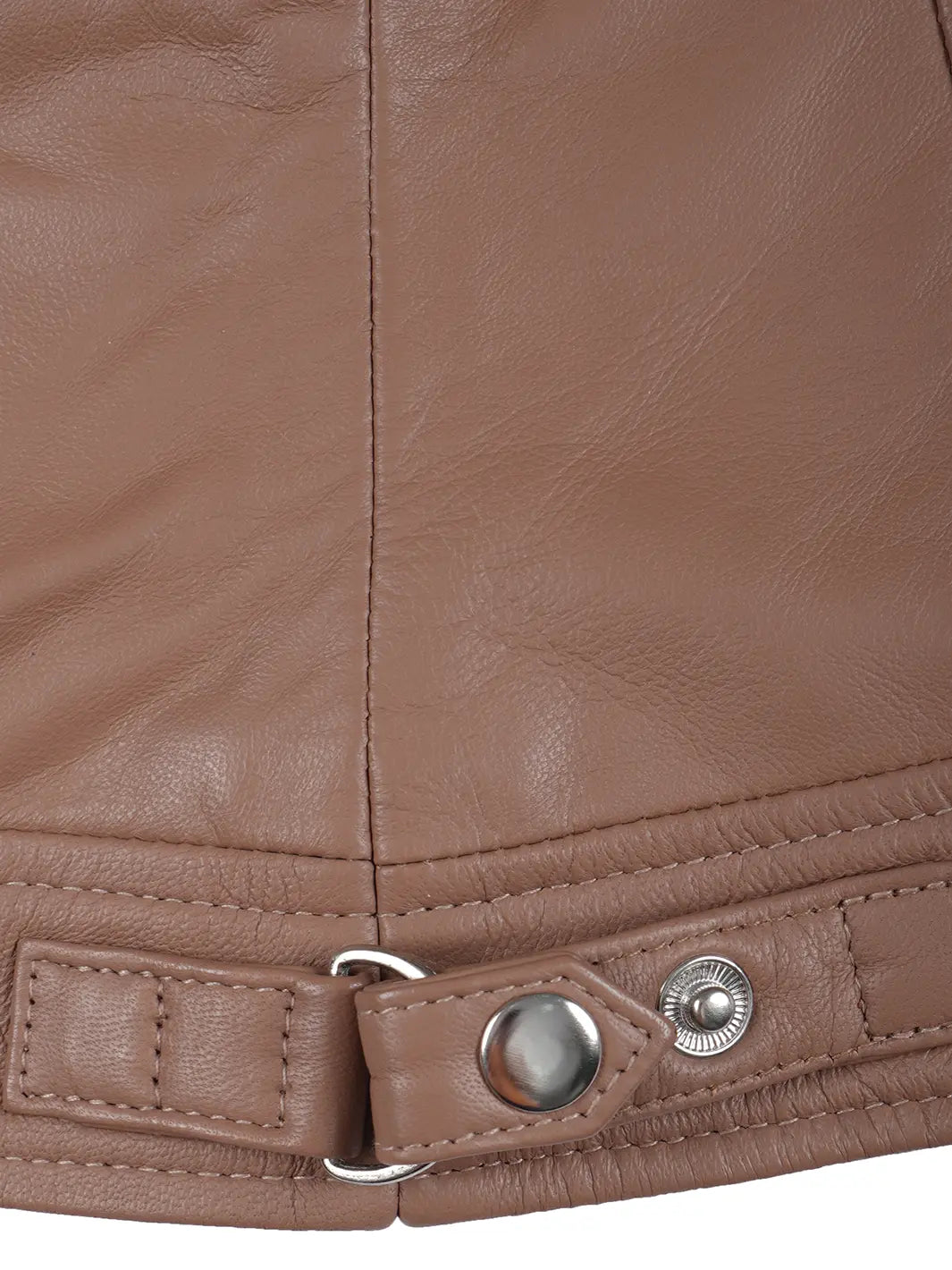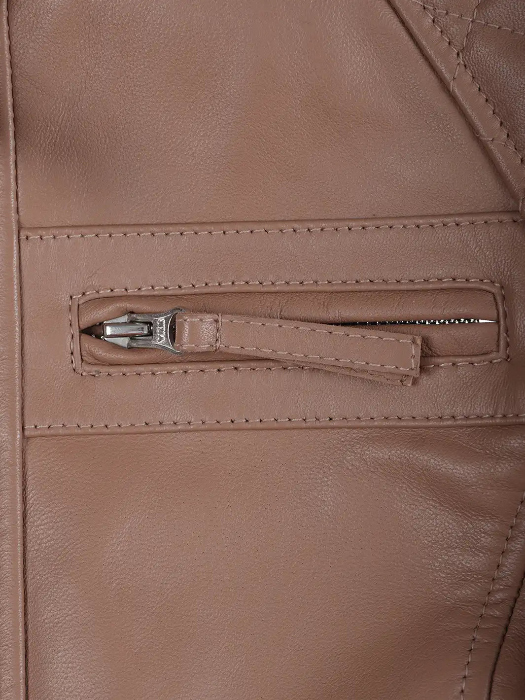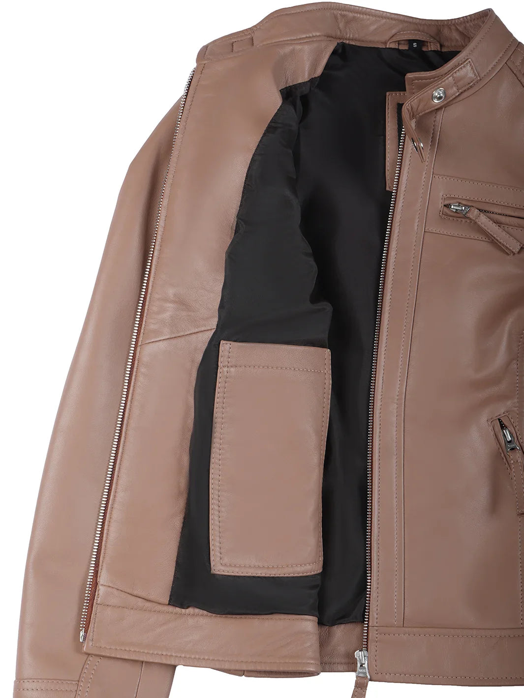 This mocha cafe racer jacket, constructed from real leather, presents a refined and feminine silhouette. Quilted shoulder panels offer added warmth while giving a stylish twist to the classic biker style. It features a full-length zipper, four exterior zip pockets, and an inner pocket to securely hold your belongings. The snap-fastening stand collar and adjustable side tabs ensure a tailored fit with a modern edge.