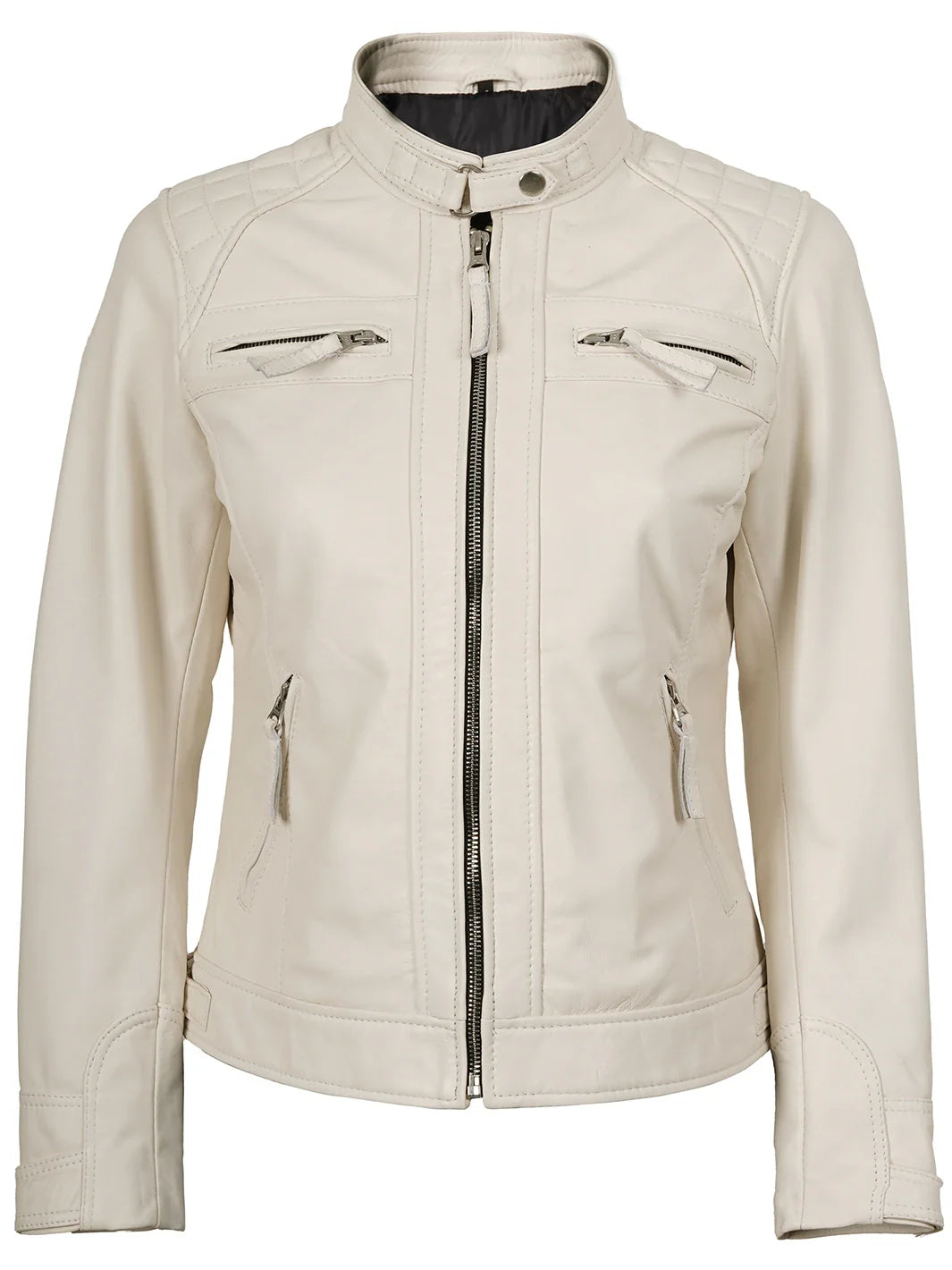 Tap into your inner rebel with the Women's White Cafe Racer Leather Jacket. Carefully crafted with meticulous attention to detail, this jacket showcases a cafe racer design that radiates edginess and confidence.