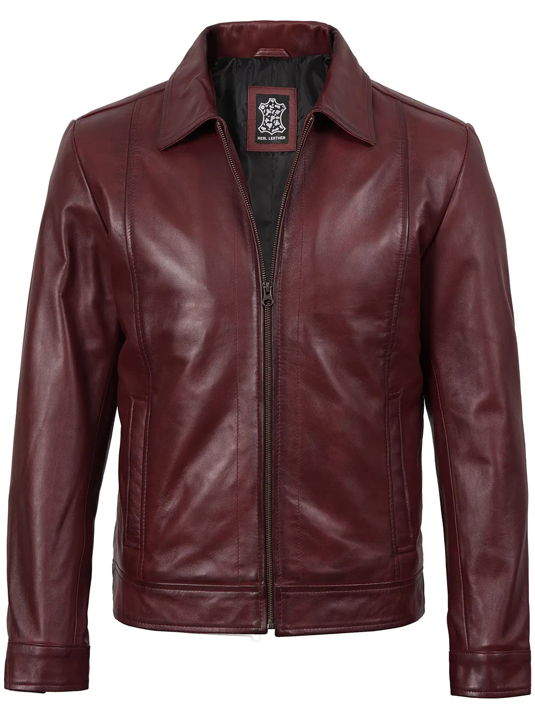A sharp Harrington jacket crafted from 100% real lambskin leather in rich burgundy. Fully lined with polyester for comfort, it features a shirt collar with zip closure, snap button cuffs, and two side plus two interior pockets—including a dedicated mobile pocket. Versatile enough to pair with any dress code, this timeless piece adds effortless style to any outfit.