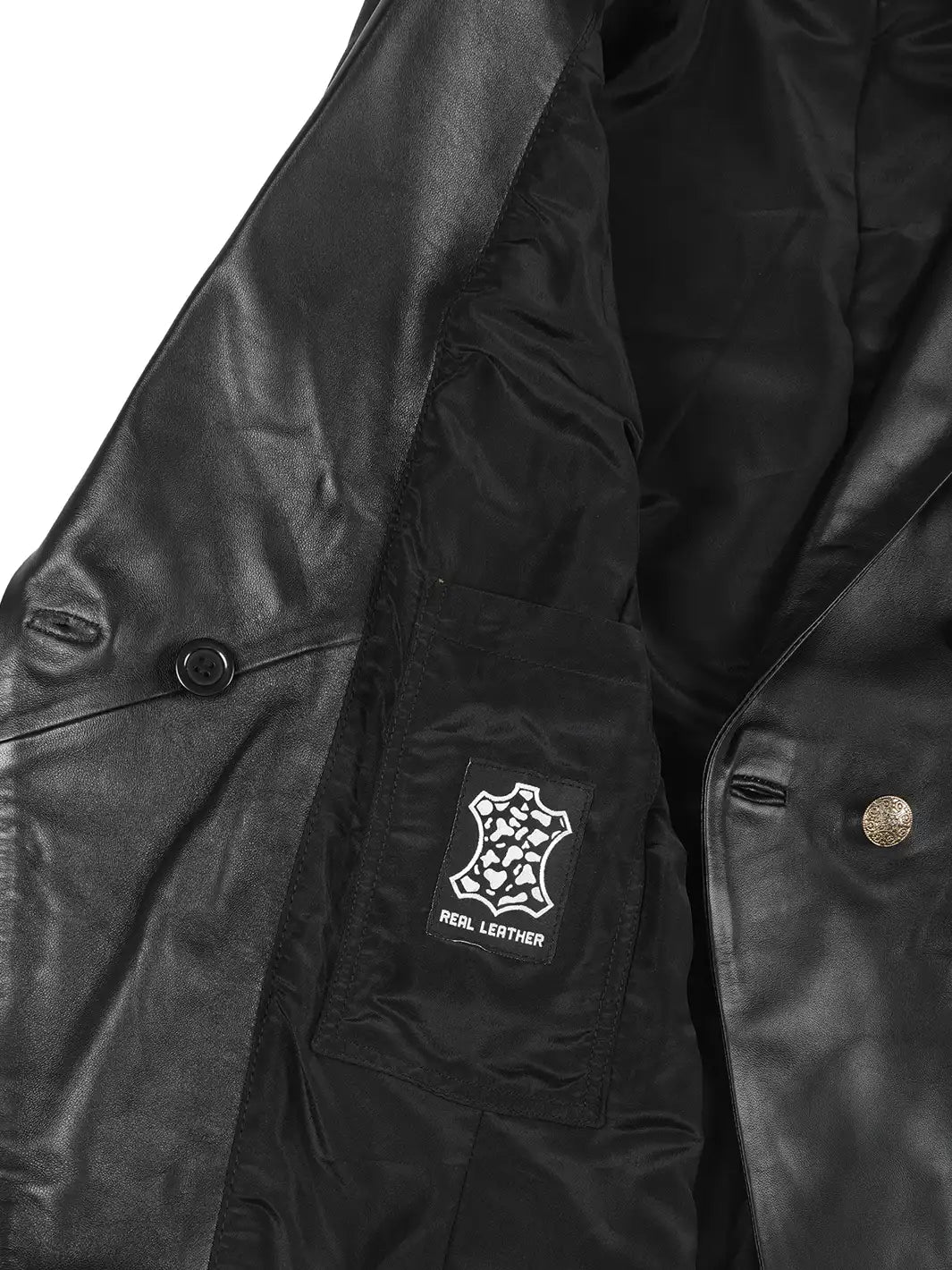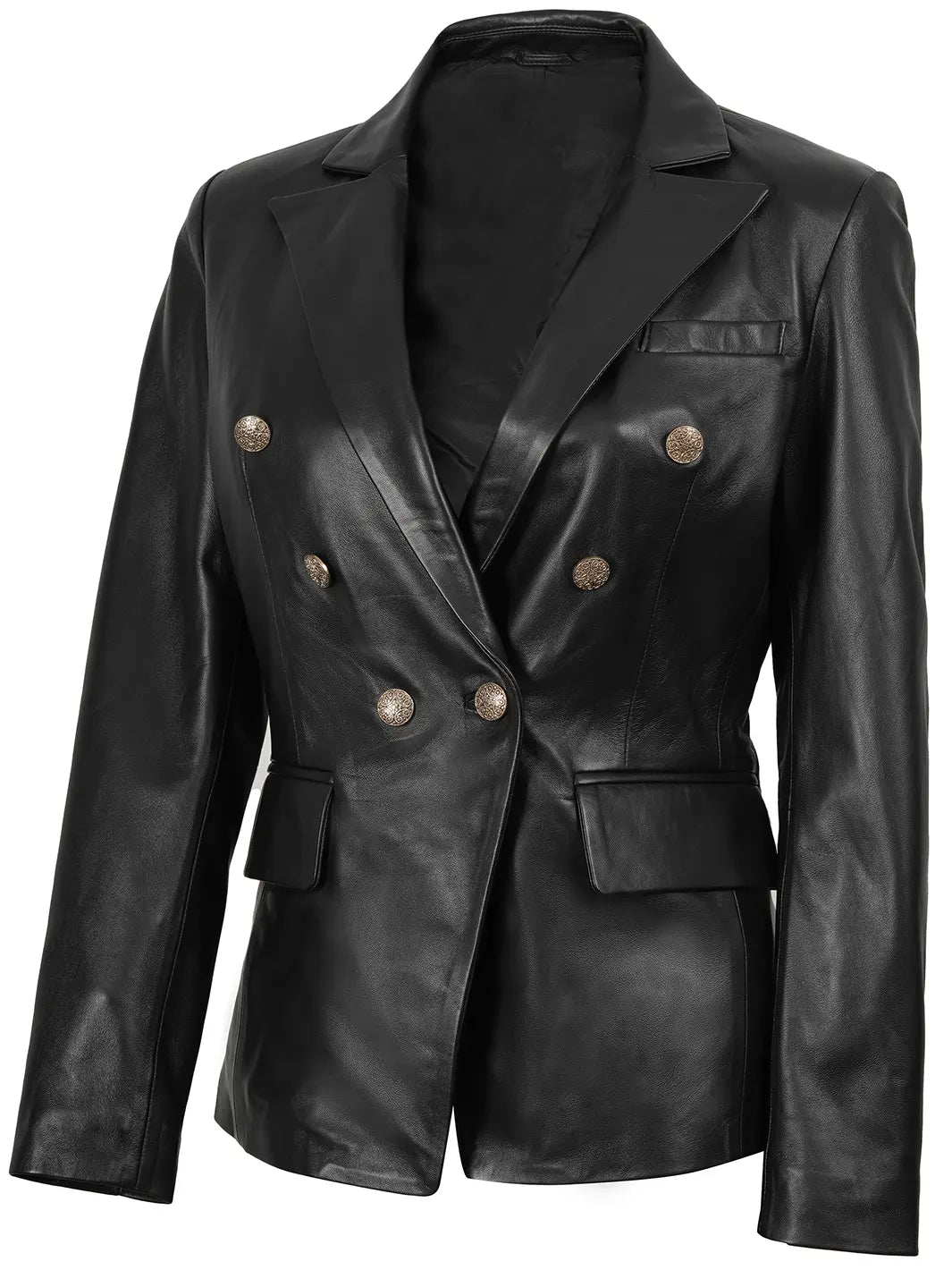 Elevate your style with the Kim women's black double breasted leather blazer, crafted from 100% real lambskin leather with meticulous attention to detail. The sophisticated double-breasted design exudes confidence and professional elegance.