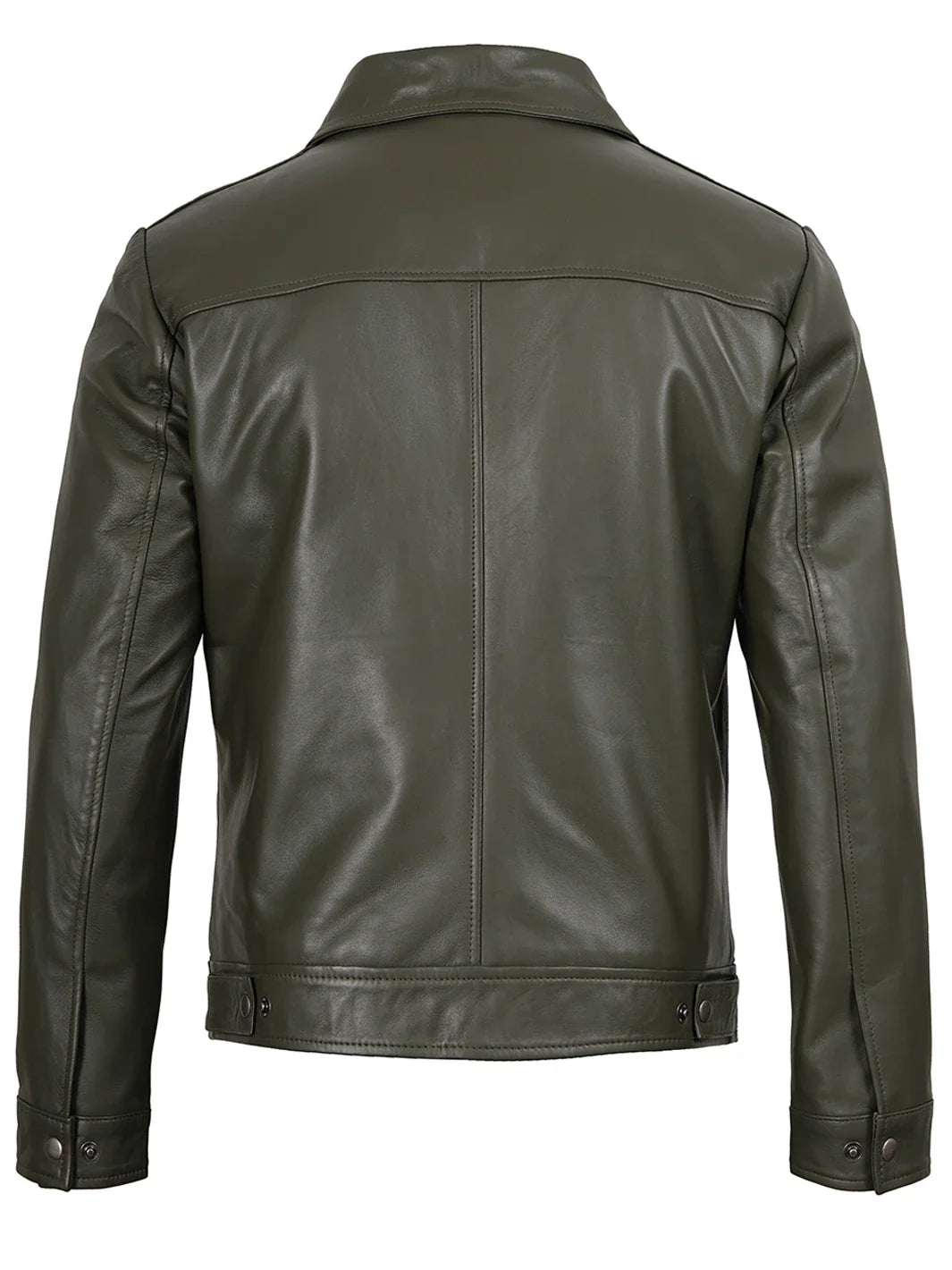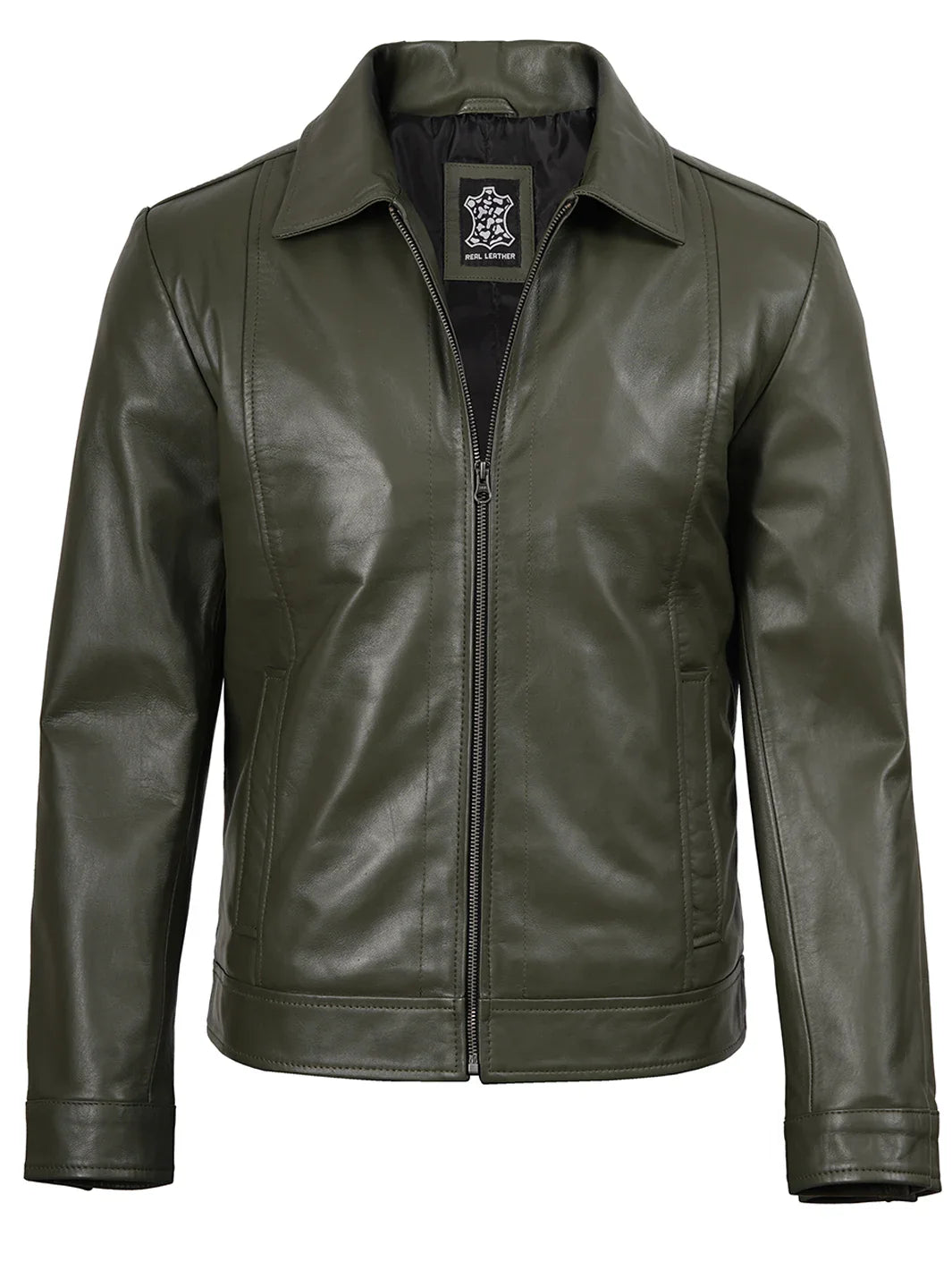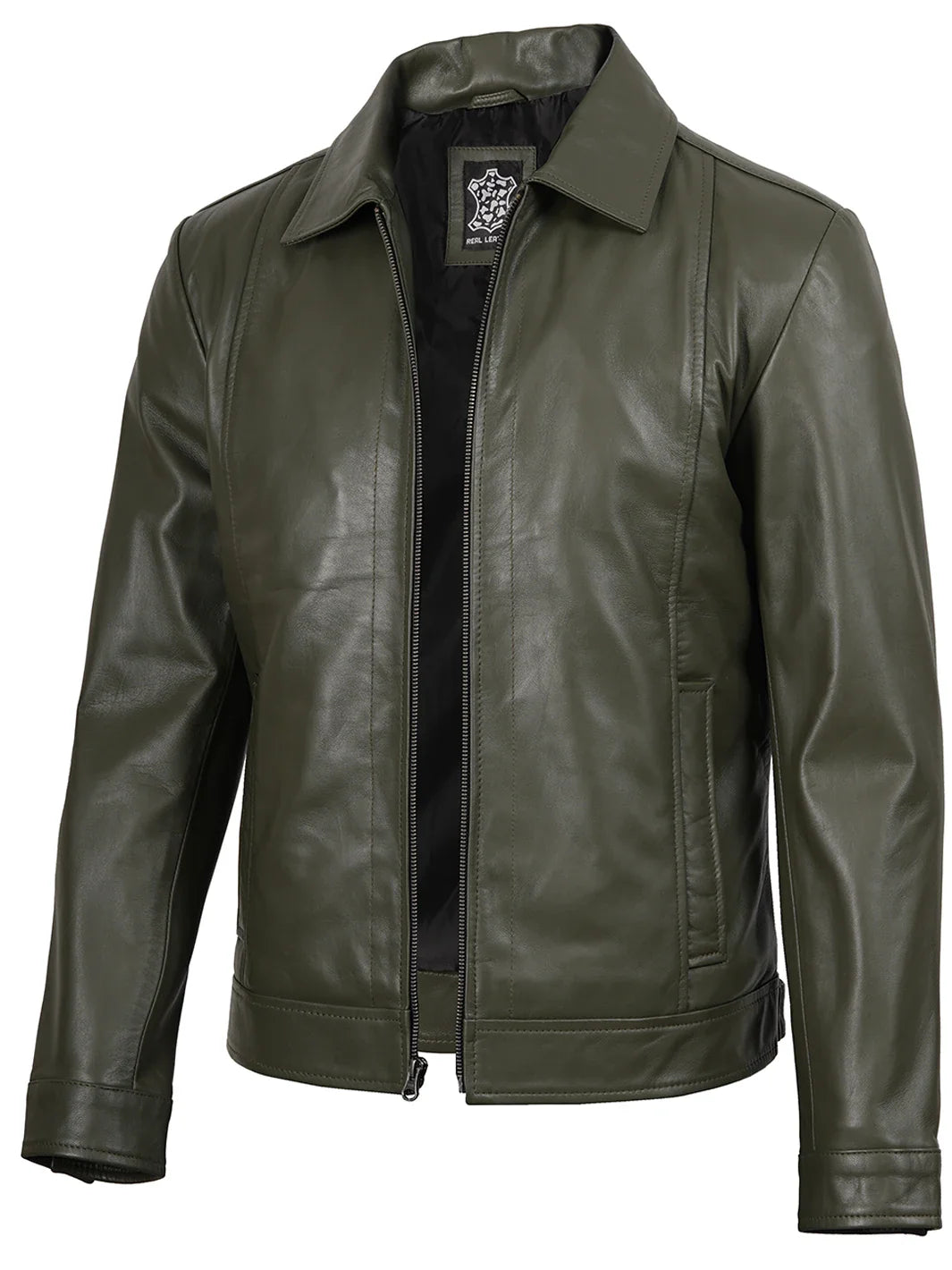 Let your style and look speak with the olive green harrington leather jacket for men. 100% real leather made with classic detailing that includes side pockets, shirt collar, and front zipper. Inside also has pockets and one for your phone.