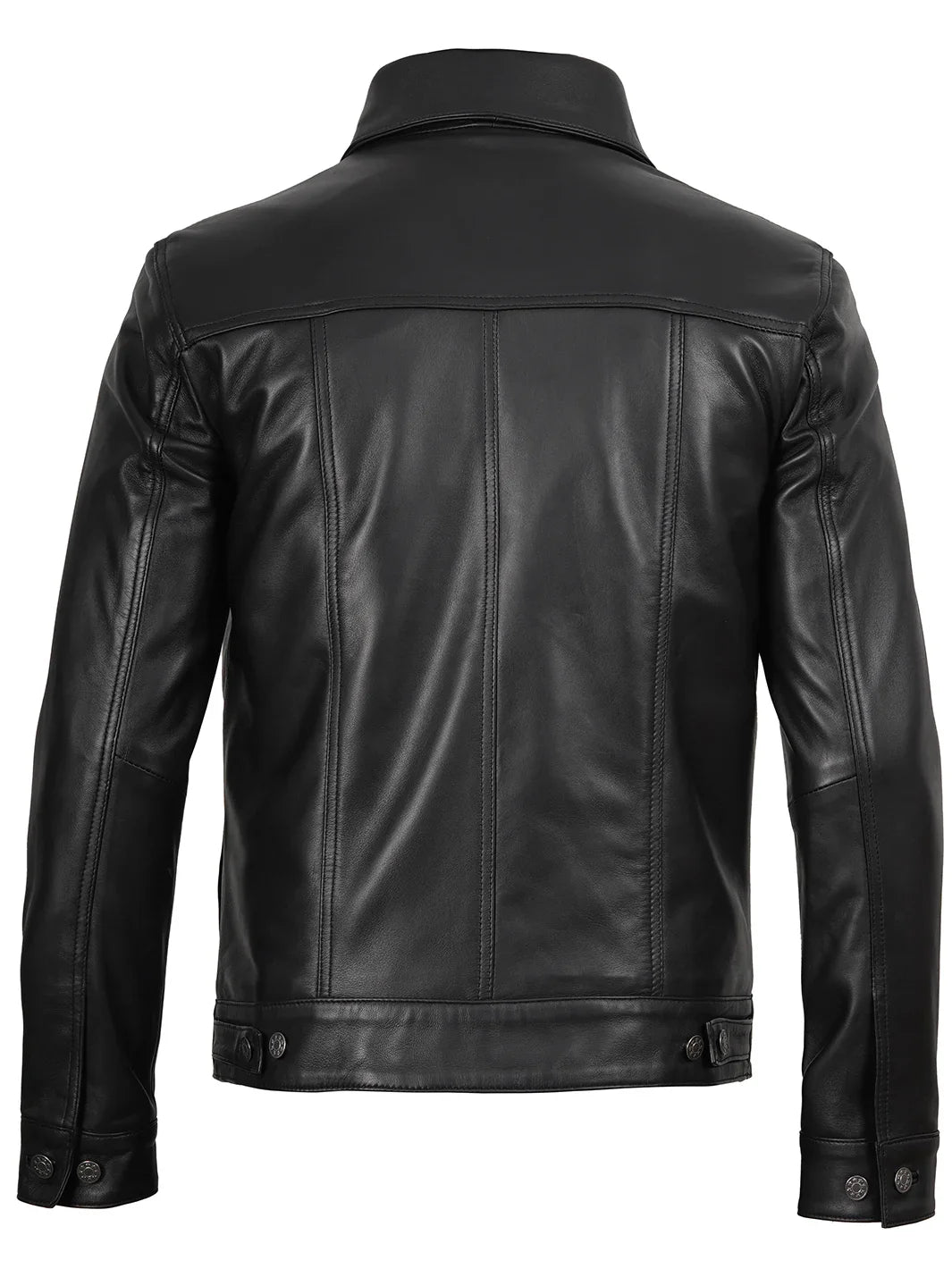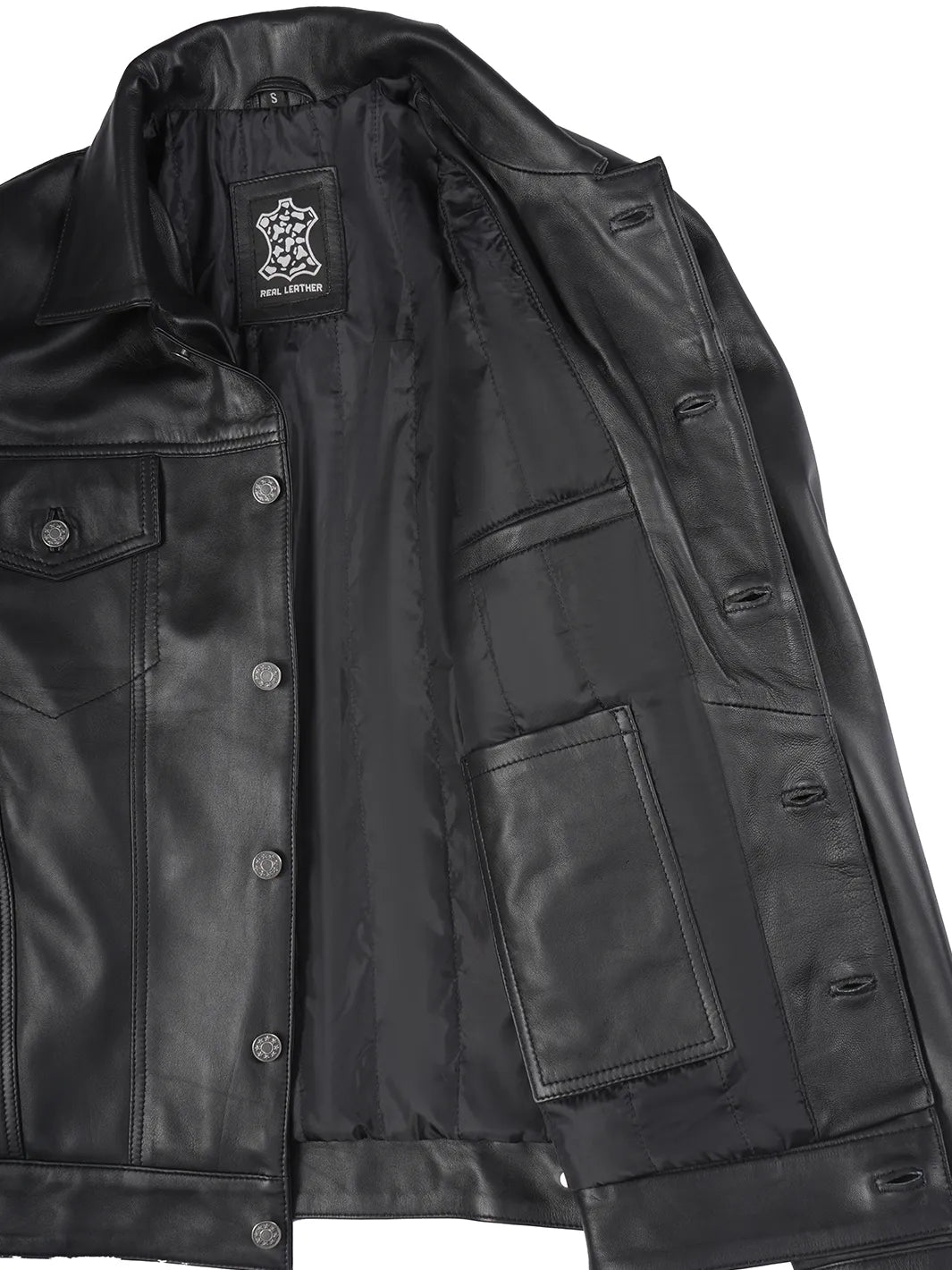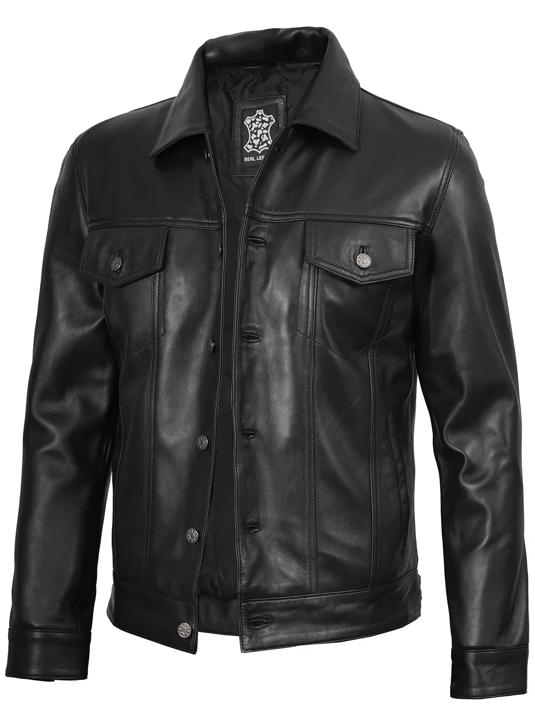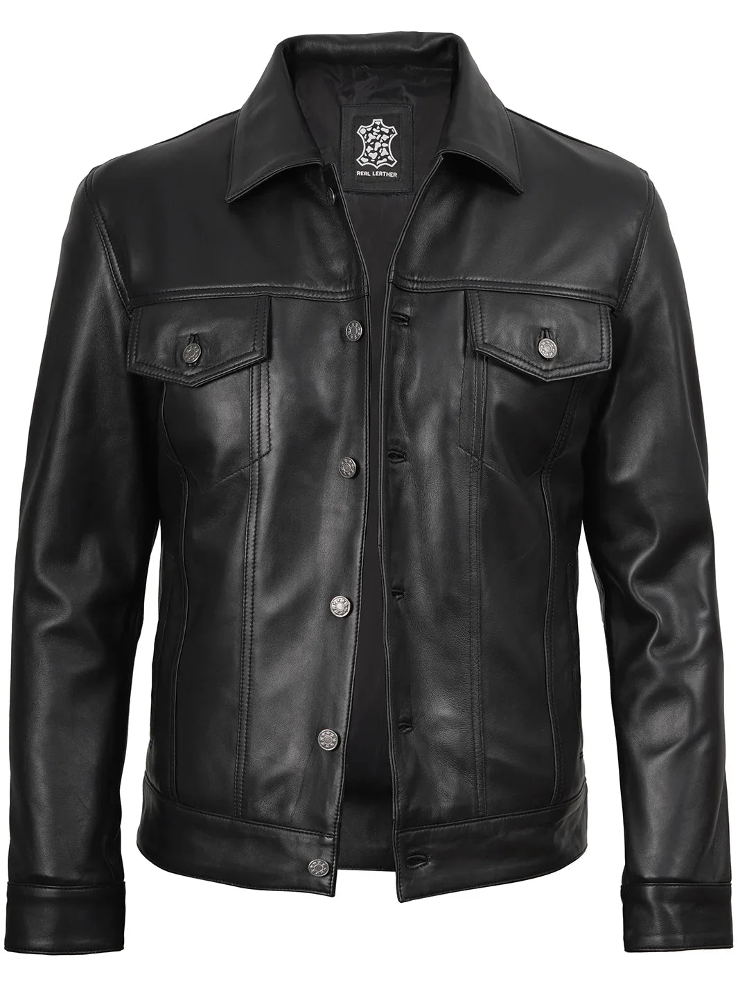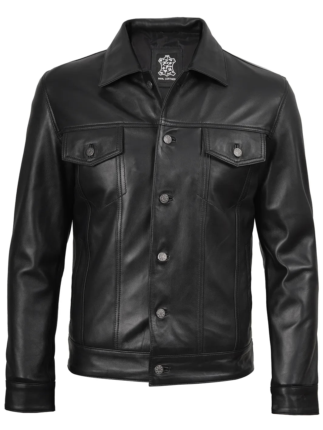 A versatile, year-round essential crafted from 100% real lambskin leather and lined with soft, skin-friendly polyester for comfort. Features a classic shirt collar with button fastenings, two flap pockets, two side pockets, and two interior pockets—including a dedicated phone pocket. Timeless black design meets rugged style, perfect for every season and every adventure.