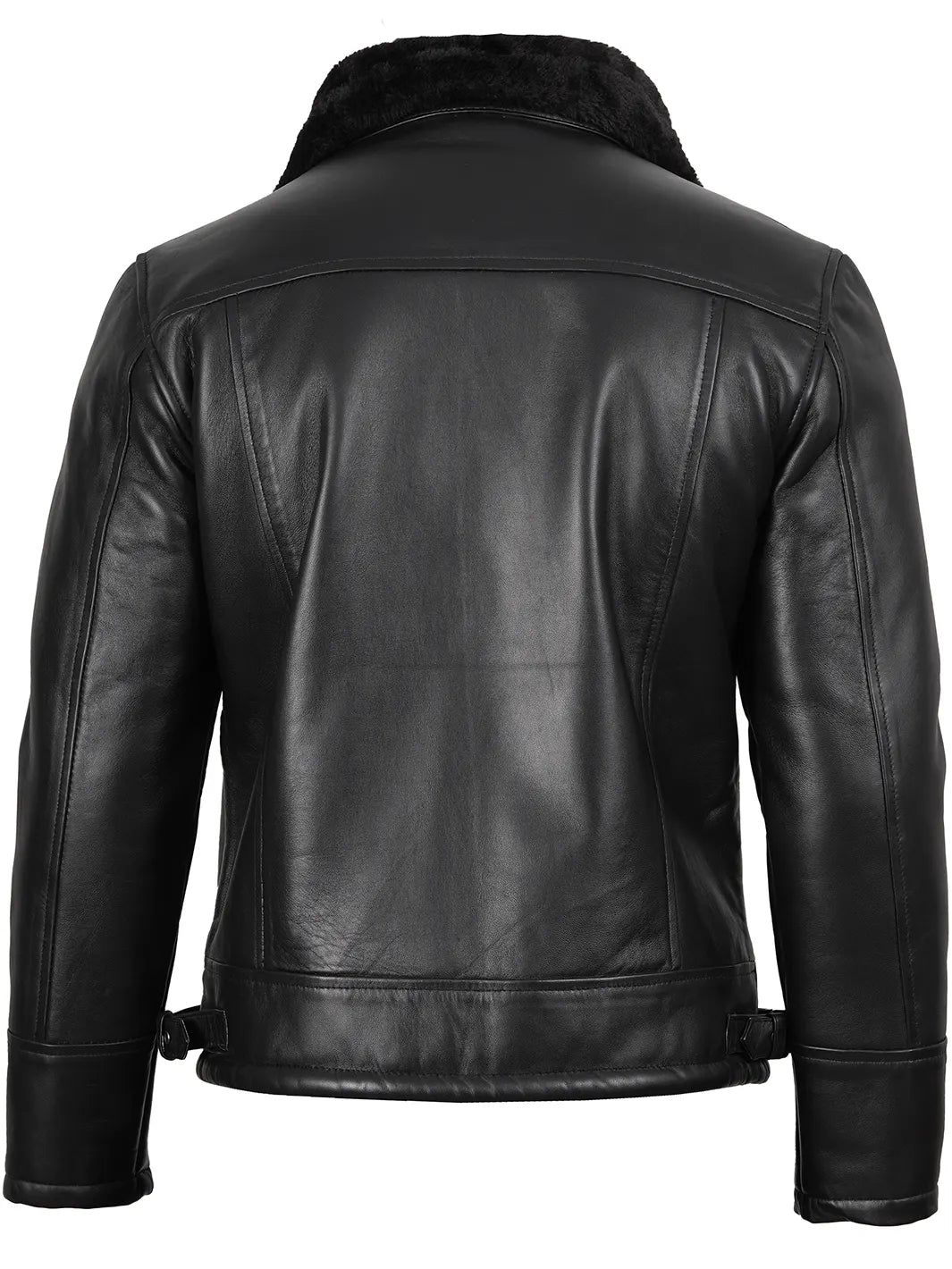 Embrace the cold in style with this rugged black leather shearling jacket. It features a plush faux shearling lining and collar that lock in warmth, paired with a streamlined zip-front design. Crafted from real leather, this piece delivers both durability and sleek sophistication, ideal for winter-ready styling.