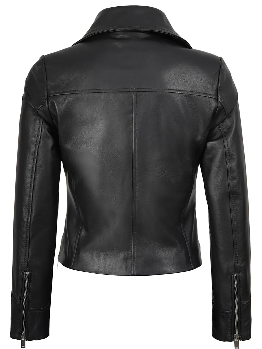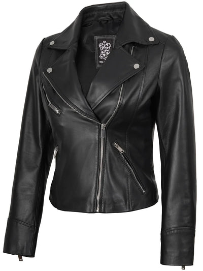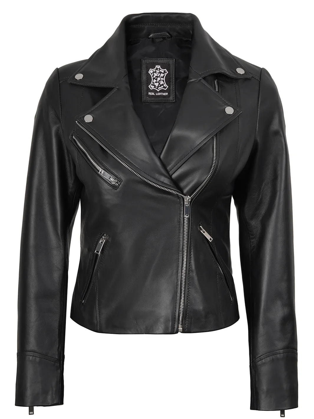 Step out with confidence in this Women's Black Asymmetrical Biker style Leather Jacket. Crafted from real lambskin leather, it features a bold zip closure, structured fit, and zipped cuffs for a sleek edge. The asymmetrical design and multiple pockets add both style and function, making it a standout piece.