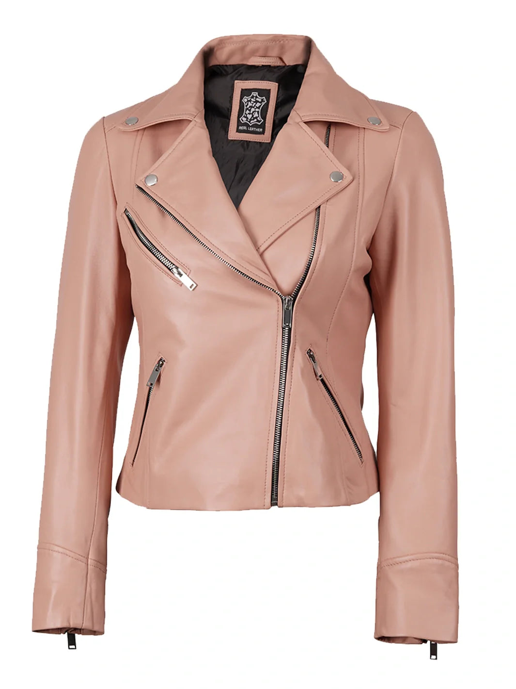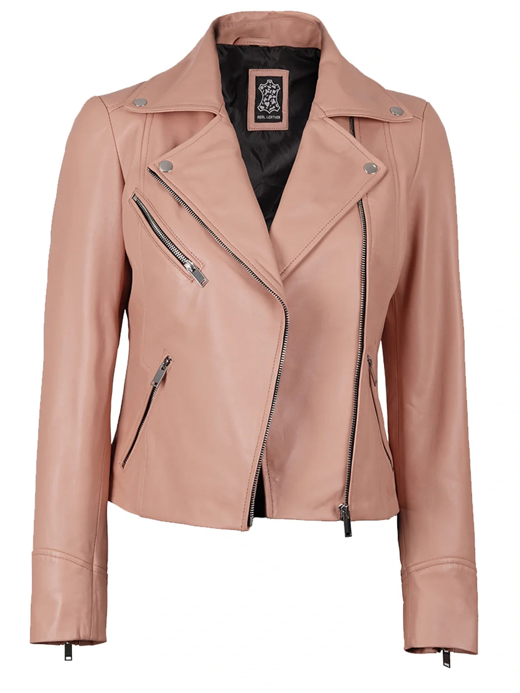 Make a bold statement with the Ninfa women's pink asymmetrical biker style jacket, crafted from 100% real lambskin leather. Designed with a snap-button lapel collar, zipper cuffs, and multiple pockets, it combines edgy styling with everyday functionality in a striking pink hue.