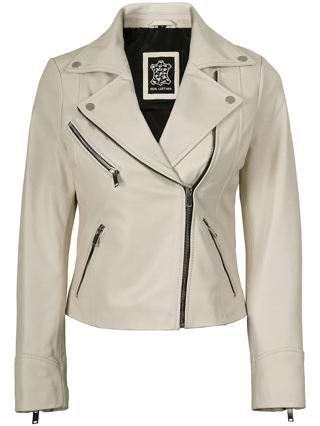 Sleek biker style meets timeless elegance. Crafted from 100% real lambskin leather in a chic off-white, it features an asymmetrical zipper front, stylish lapel, and zipper cuffs for bold edge. With three exterior and one interior pocket, plus soft polyester lining for comfort. A standout piece that elevates any outfit—professional leather cleaning recommended.