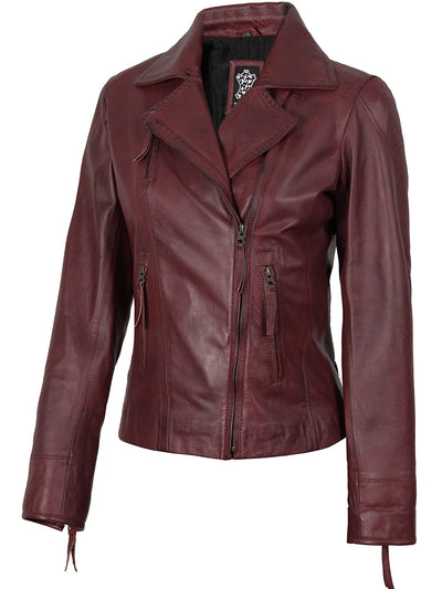 Step into standout style with this women's burgundy biker style jacket, crafted from real lambskin leather. The asymmetrical zip, smooth finish, and tailored fit give it a bold, modern edge. Featuring three exterior zip pockets and soft inner lining, it's both functional and fashion-forward. A wardrobe staple with a striking twist.