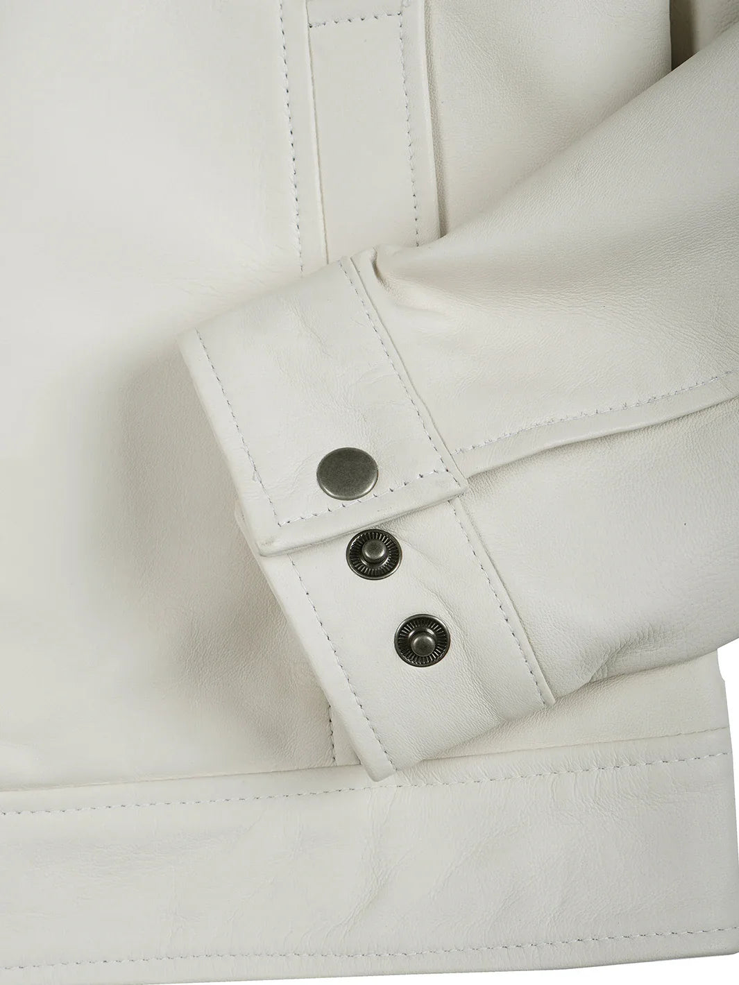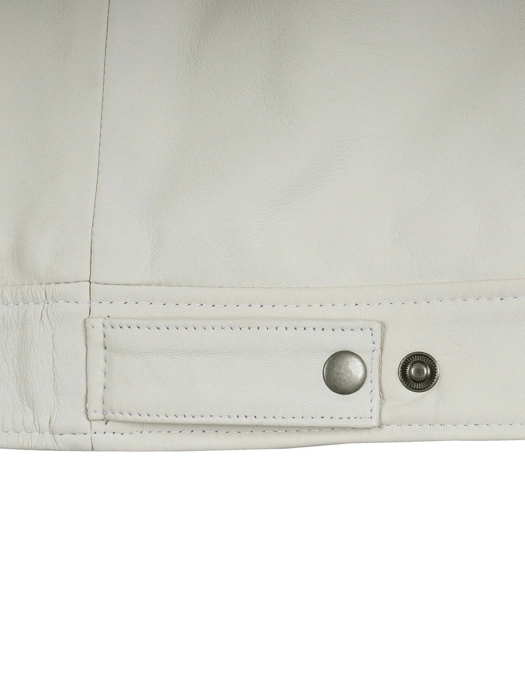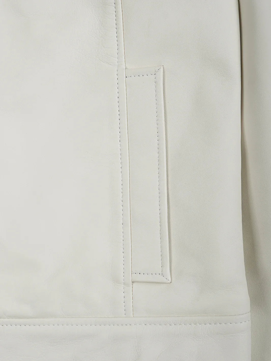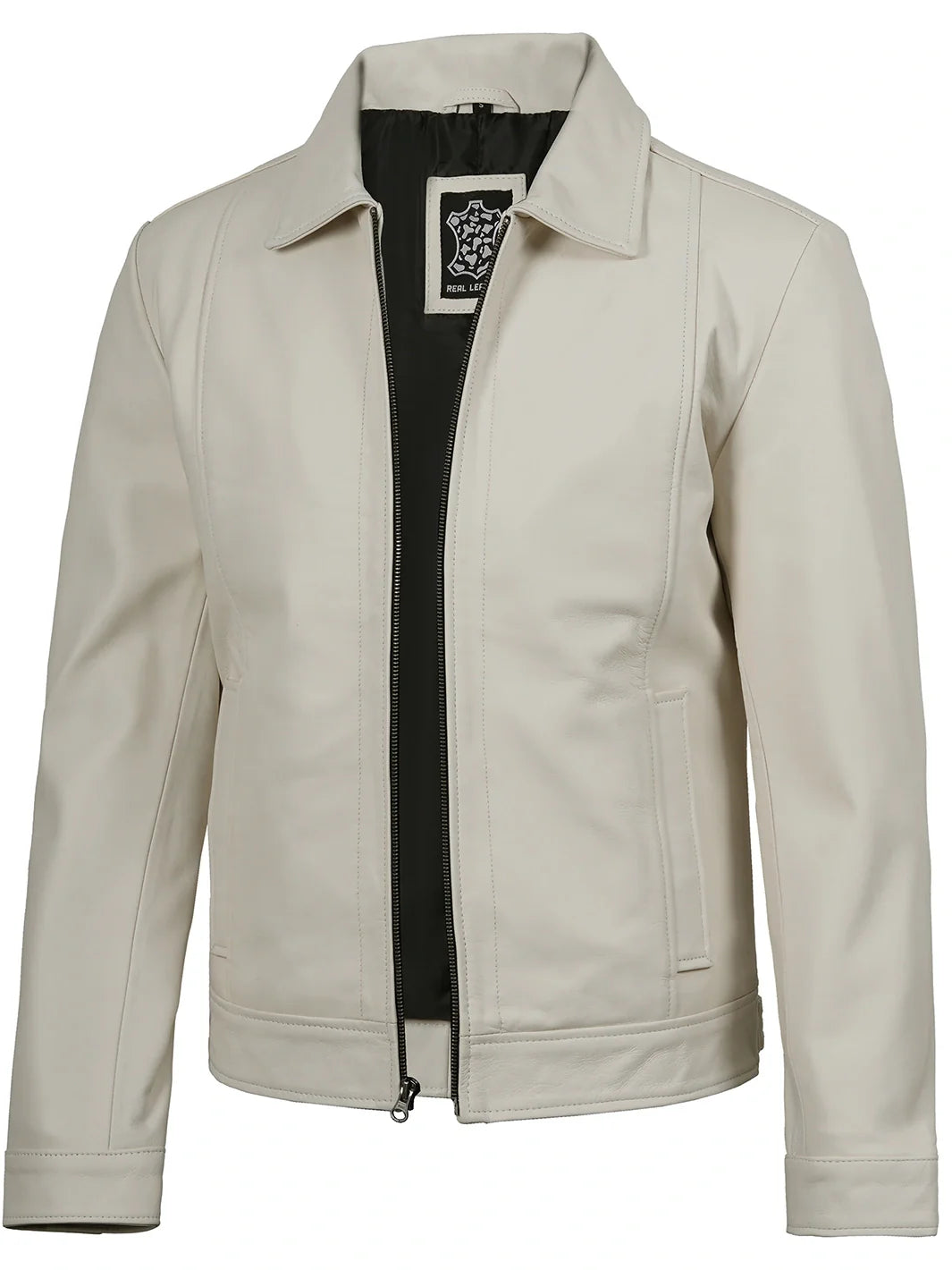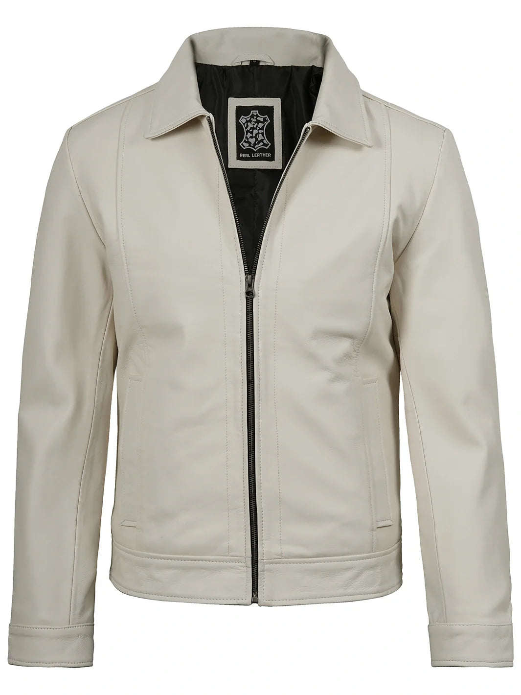 A sleek Harrington jacket crafted from 100% real lambskin leather in soft off-white. Featuring a shirt-style collar, zipper closure, and two exterior plus two interior pockets—including a dedicated phone pocket—for practical, everyday wear. Smooth and stylish, it offers a modern twist on a classic design.