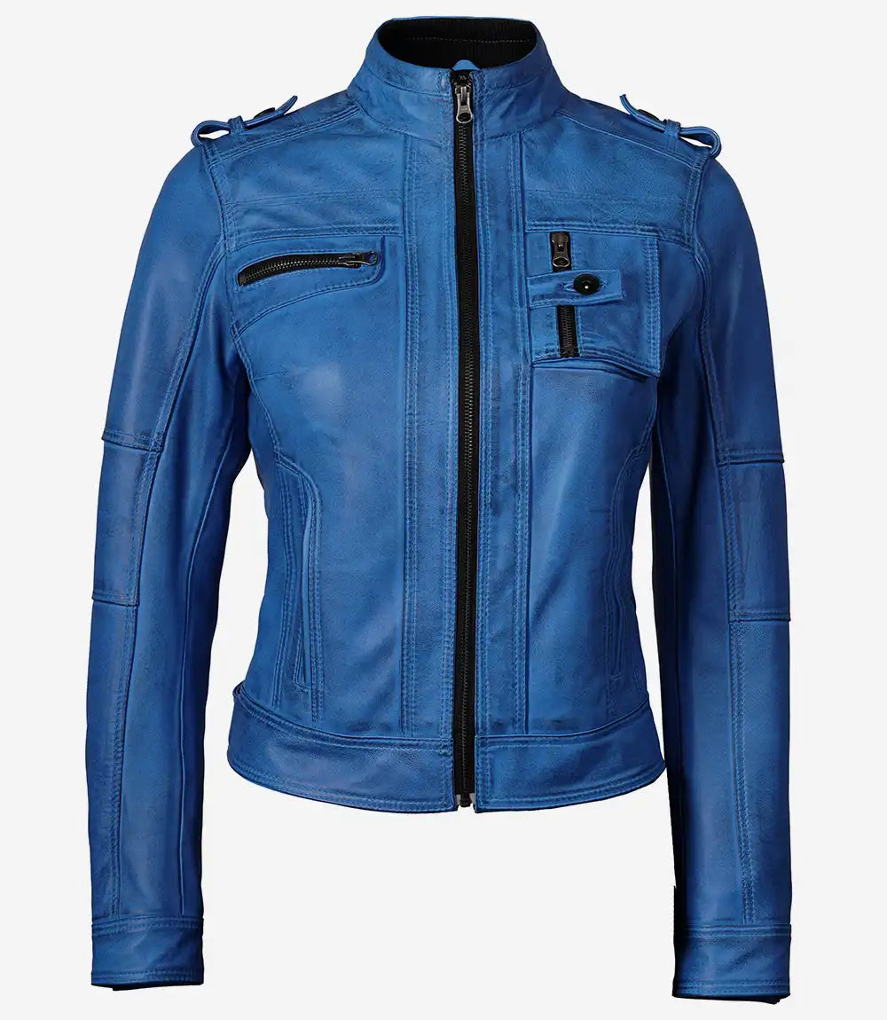 Stand out with this women’s blue leather biker jacket, featuring a striking distressed finish for a vintage-inspired look. Made from real lambskin leather, it’s designed with a sleek zip-front closure and practical pockets, making it a bold yet versatile choice for any occasion.