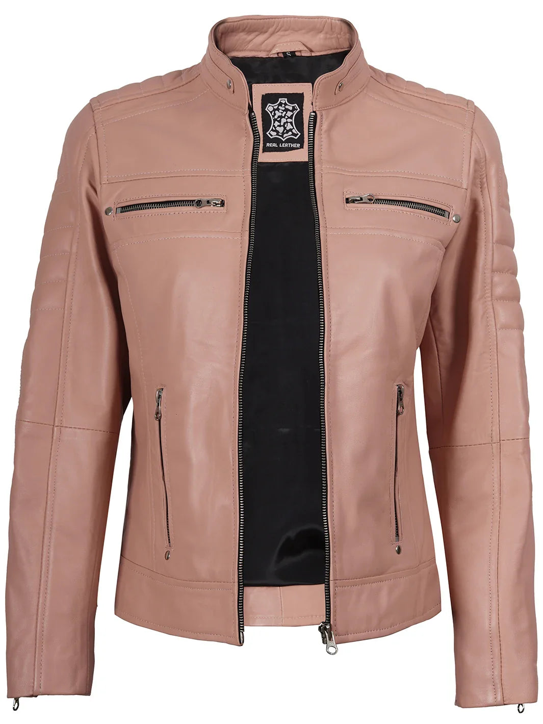 Discover the Women's Pink Cafe Racer Style Leather Jacket, a captivating embodiment of edgy style and timeless allure. Crafted from real leather, this jacket seamlessly captures the spirit of the classic cafe racer design.