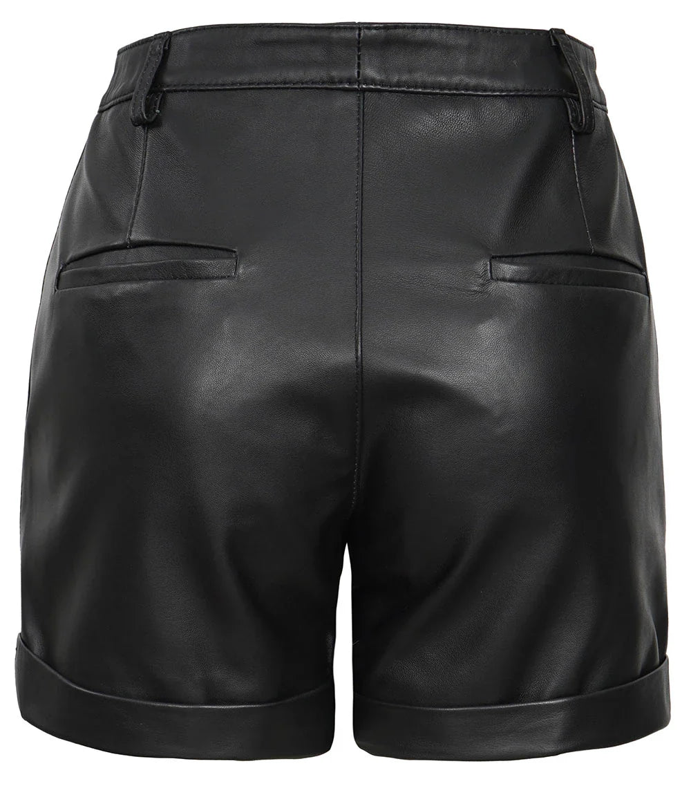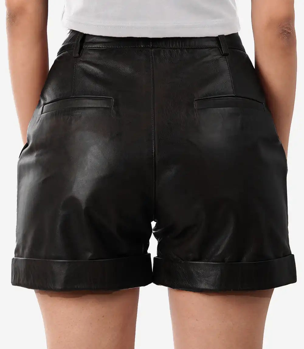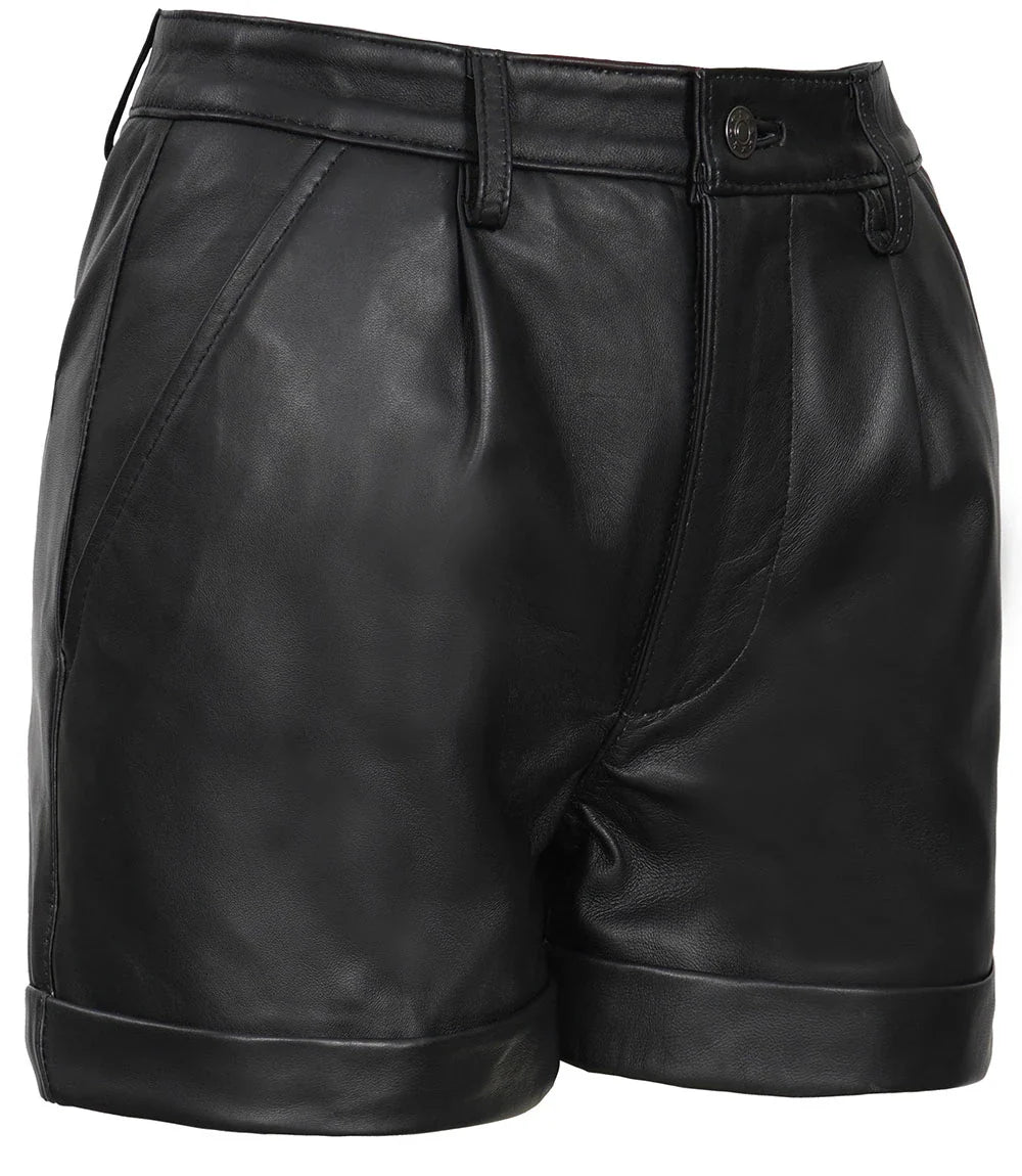 Enhance your wardrobe with these black genuine leather shorts designed for women. Made from real leather, they provide a luxurious touch and exceptional durability. Featuring a slim fit and elegant black hue, these shorts bring sophistication to any ensemble.