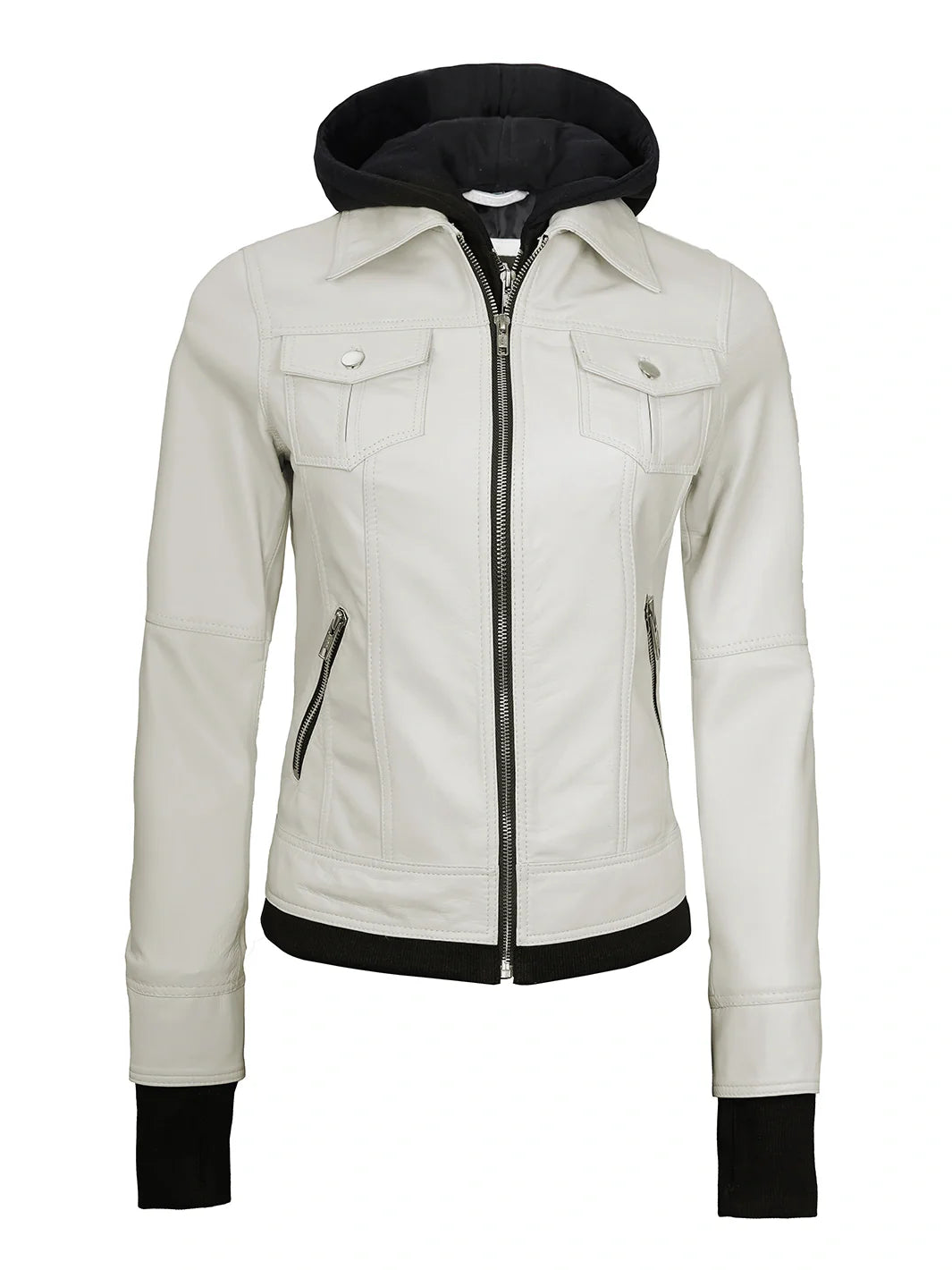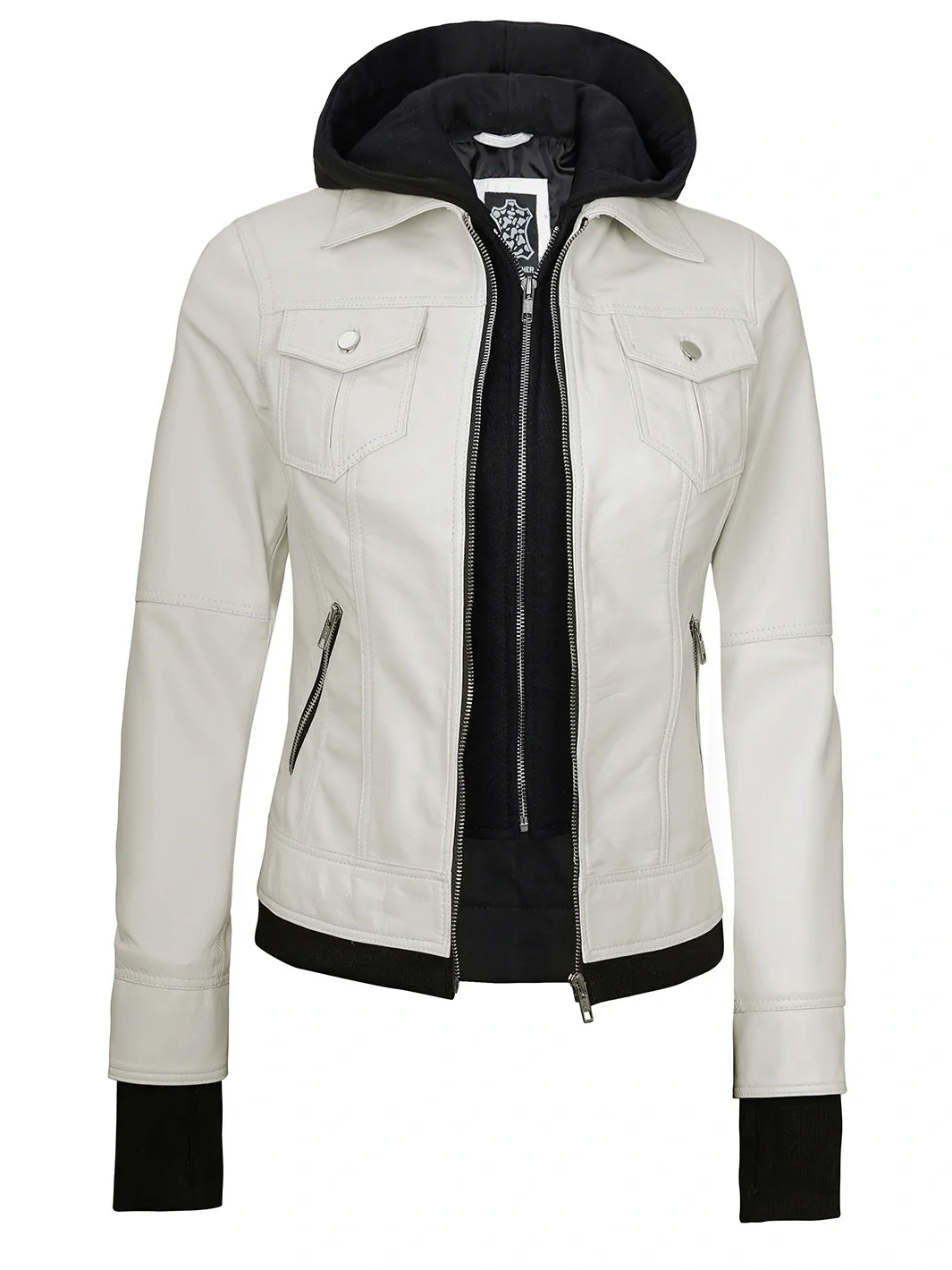 Add a sleek edge to your look with the Tralee Women's White Biker Style Jacket. Made from real leather, it features a practical hood, clean off-white finish, and zippered front for a sharp, functional design. A versatile piece that balances bold style with everyday comfort.